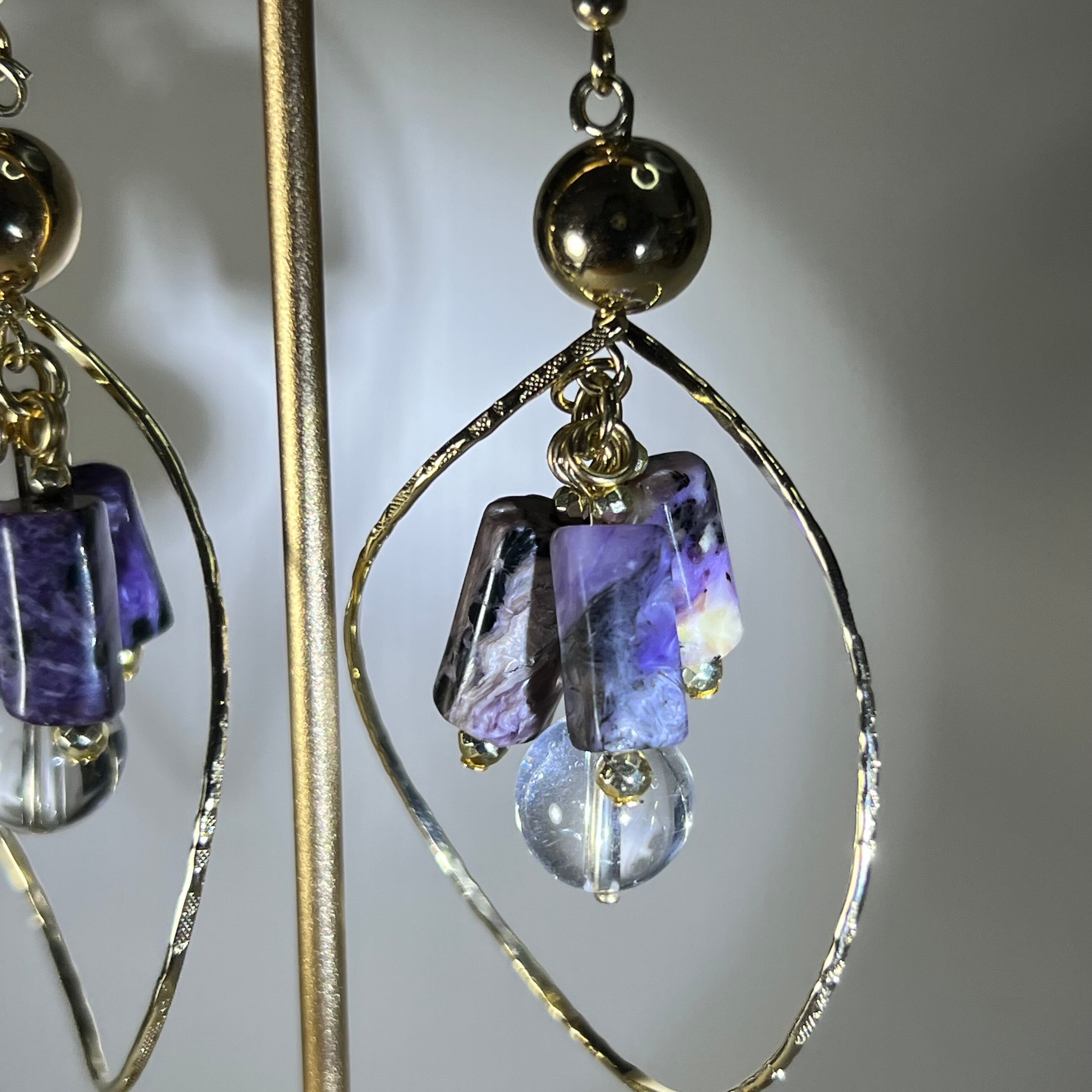 スピリチュアルな感性と直感力を高めるチャロアイト&クリスタル ティアドロップピアス【7-6】