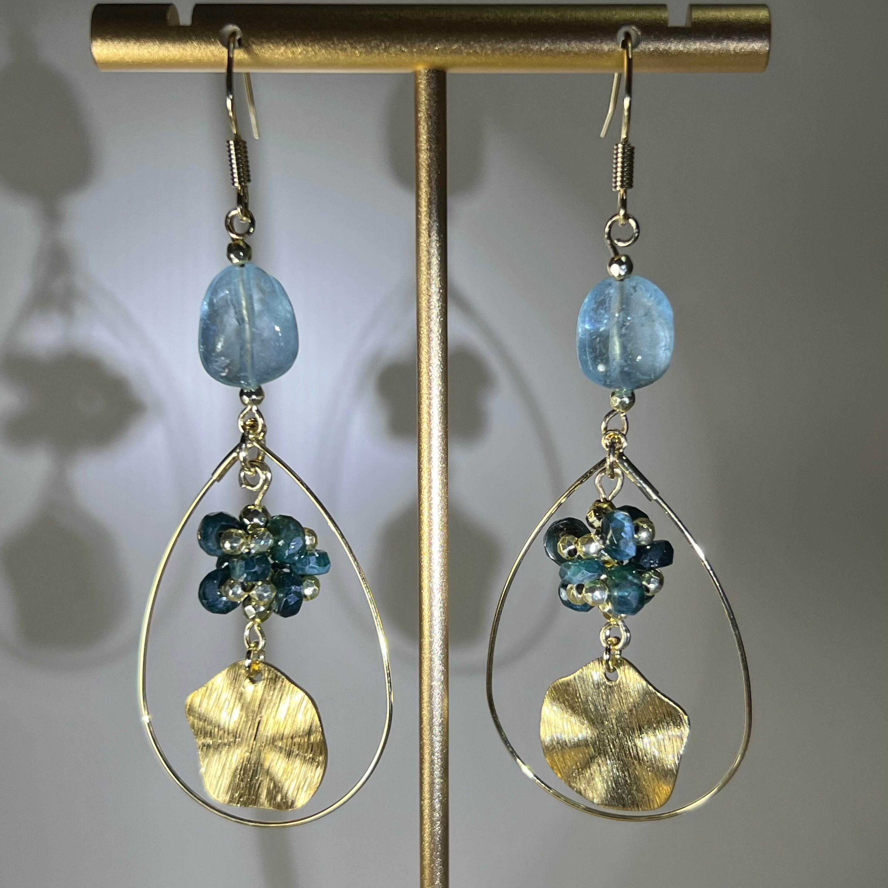 ティアドロップフープ(ゴールドカラー)をベースに、上部にブルートパーズ約10×11 mmを一粒、中央にはグランディディエライトチップ(約2〜3 mm)を小花のように束ね、さりげなくゴールドのヘマタイトビーズで光を添えました。下部で揺れるクラフト感のあるゴールドプレートが、流れる雫に花びらが重なる景色を演出。