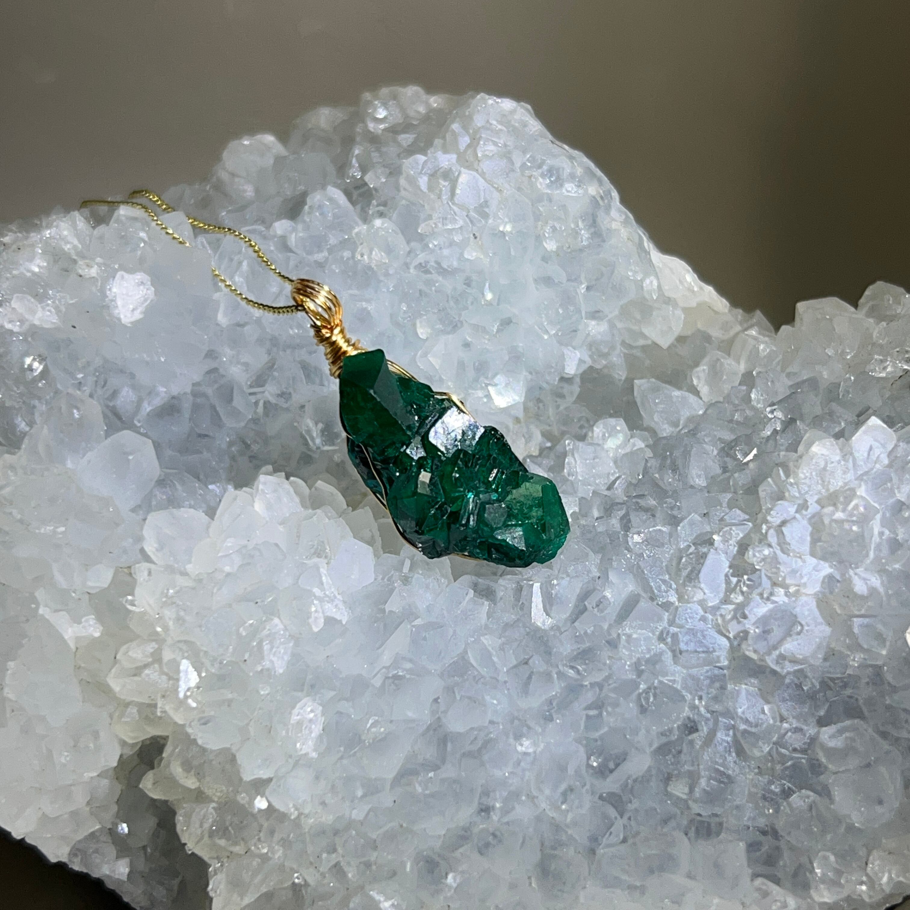 スピリチュアルな学びやヒーリングワークのお守りにぴったりなダイオプテーズ原石ワイヤーペンダント【7-25】