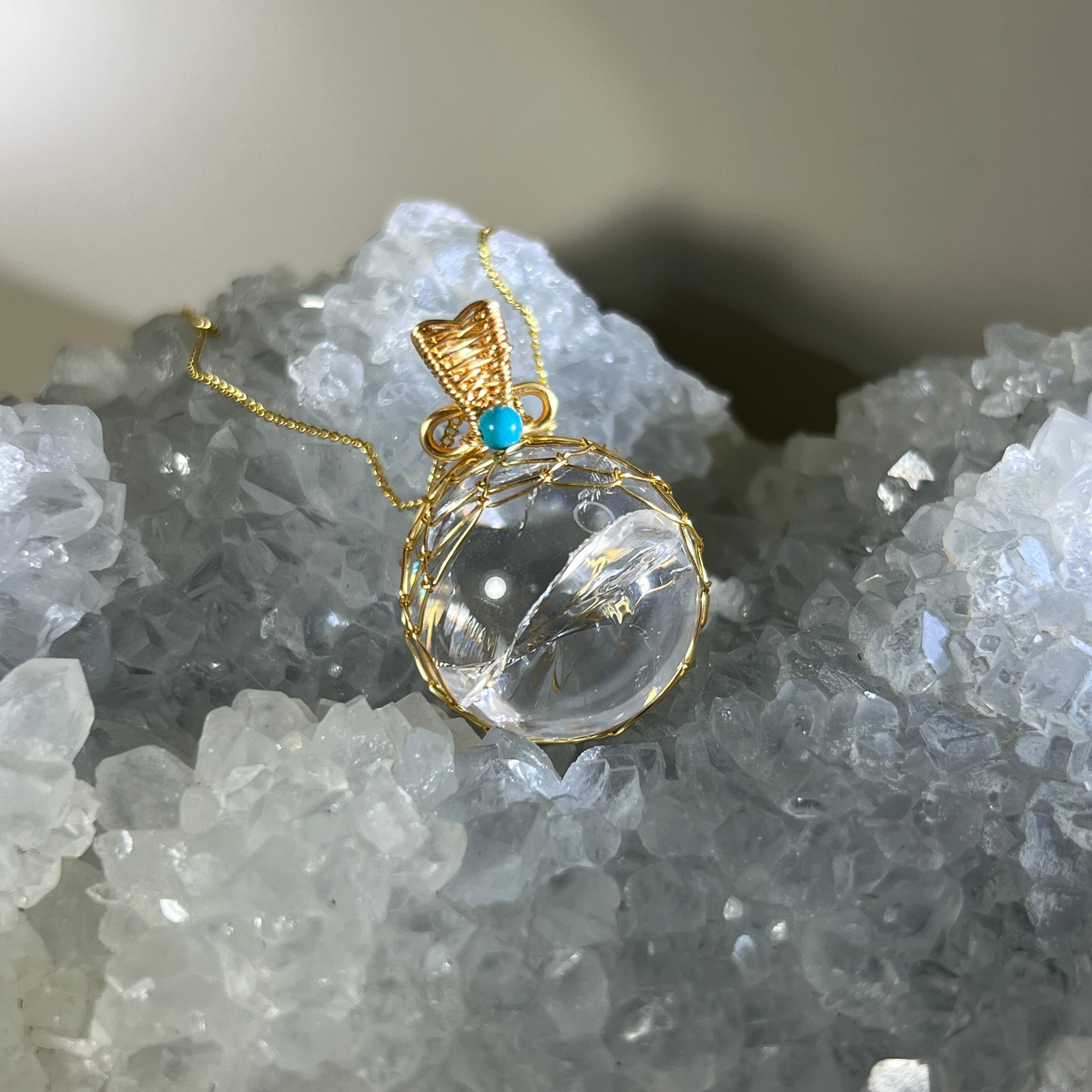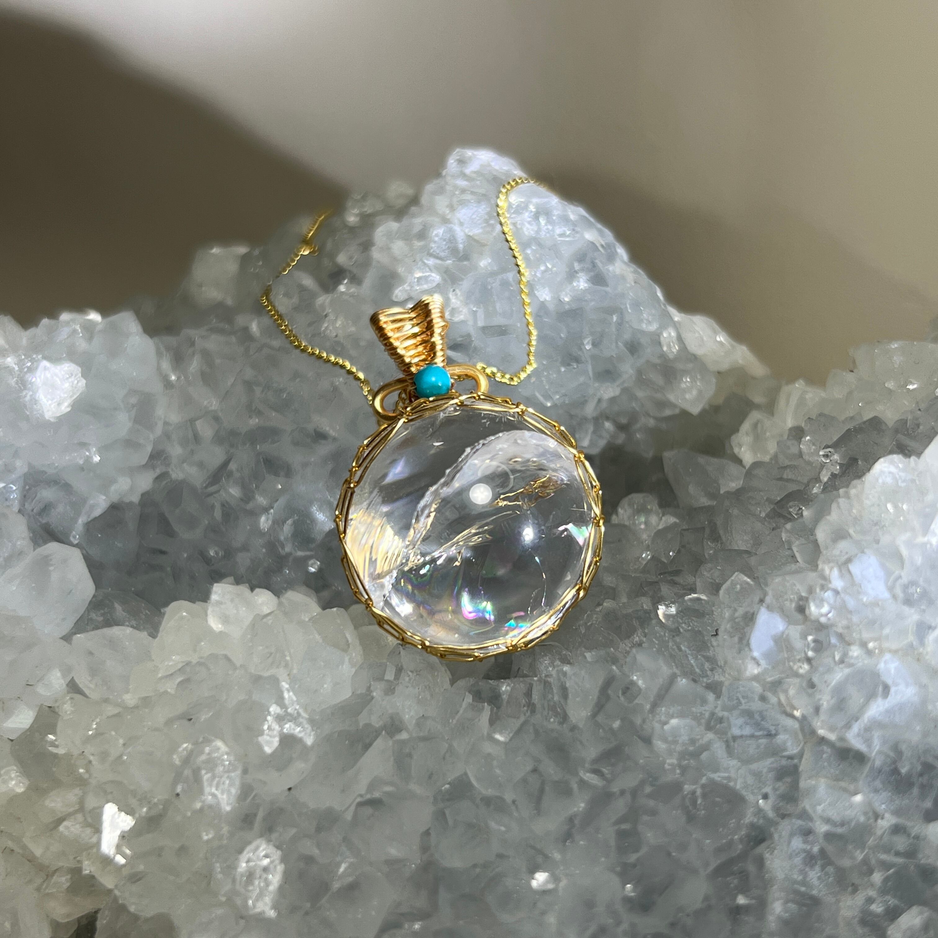 自由に軽やかに生きたい人の道を守りながら照らしてくれる虹入りクリアクォーツとターコイズのワイヤーラッピングペンダント【7-29】
