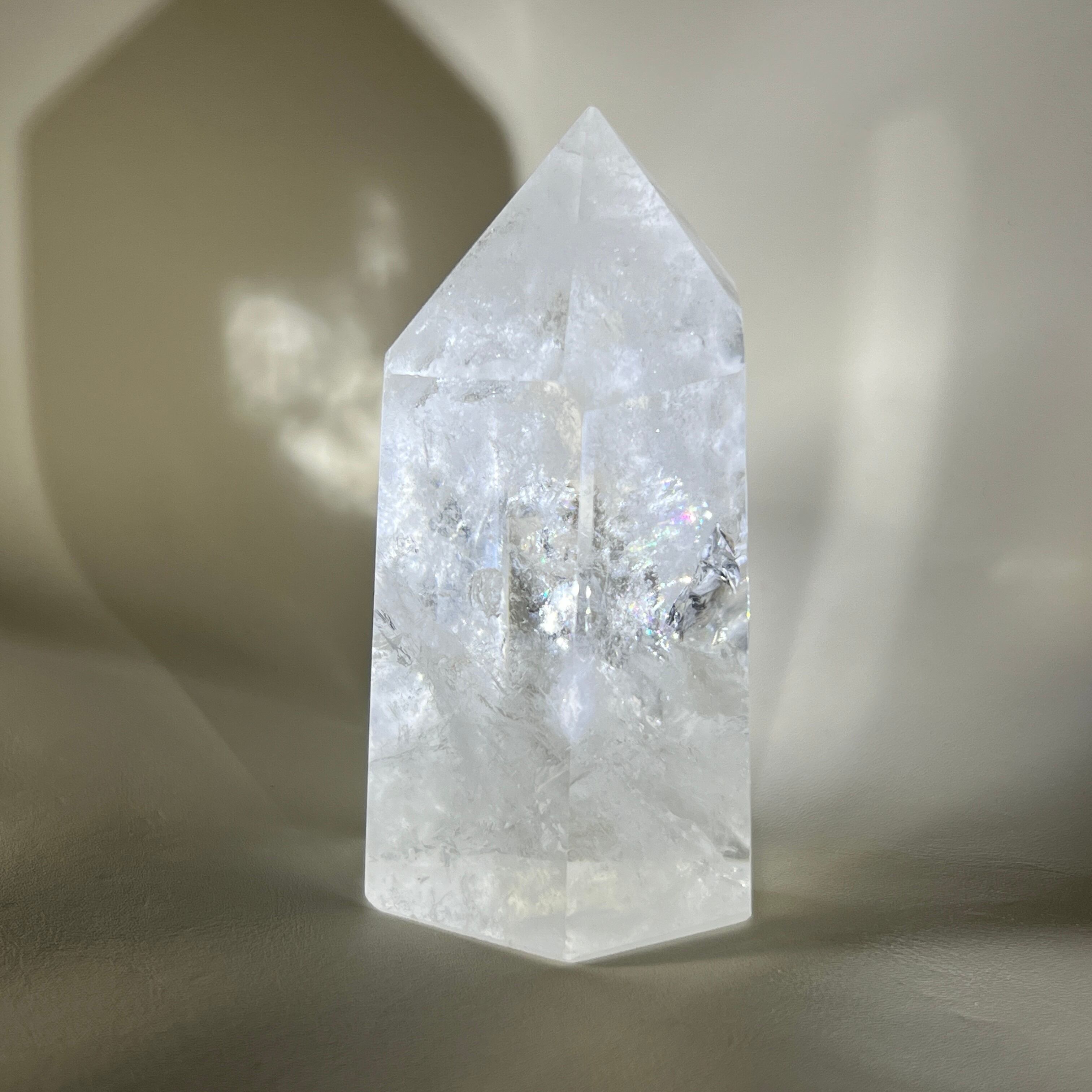英名クリスタルの語源は、古代ギリシャ語で「氷」を意味する言葉に由来します。澄んだ透明感から清明さの象徴として親しまれ、祈りの道具や装身具にも用いられてきました。先端に向けてまとまる形状は、意識を一点に集めるイメージを与えます。
