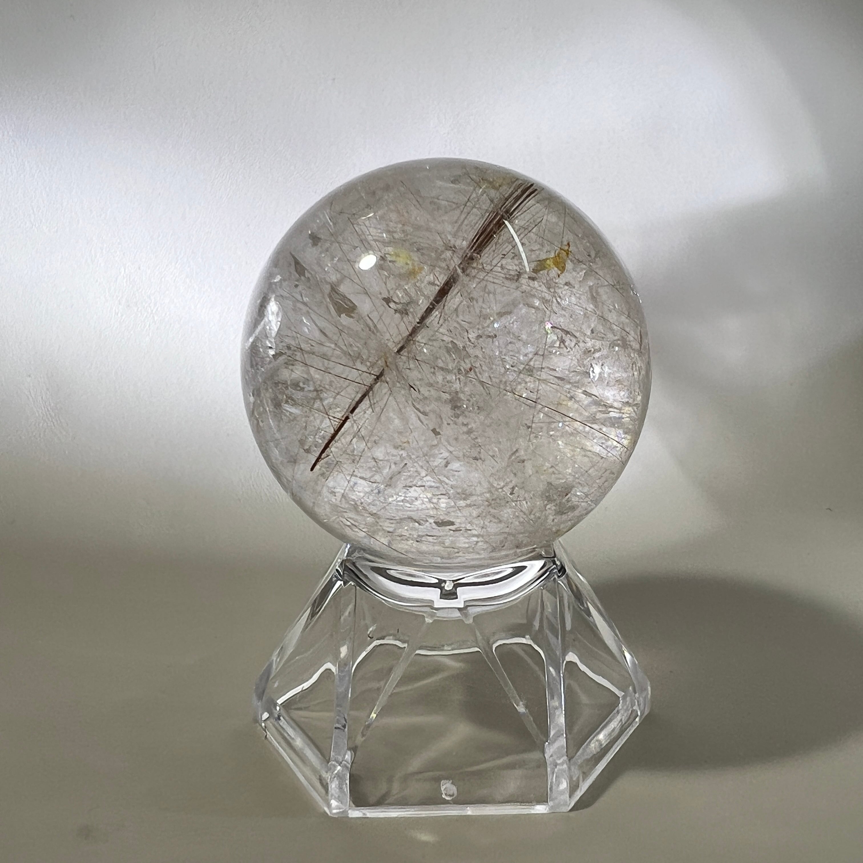 ルチルクオーツは水晶の中に繊細な金色〜銅色の線が走ることから名づけられました。「ルチル」は輝きを意味する言葉に由来し、古くから意志の明るさを象徴する石として親しまれてきました。スフィア形状は光をやわらかく受け止め、内側の表情を均一に見せてくれます。