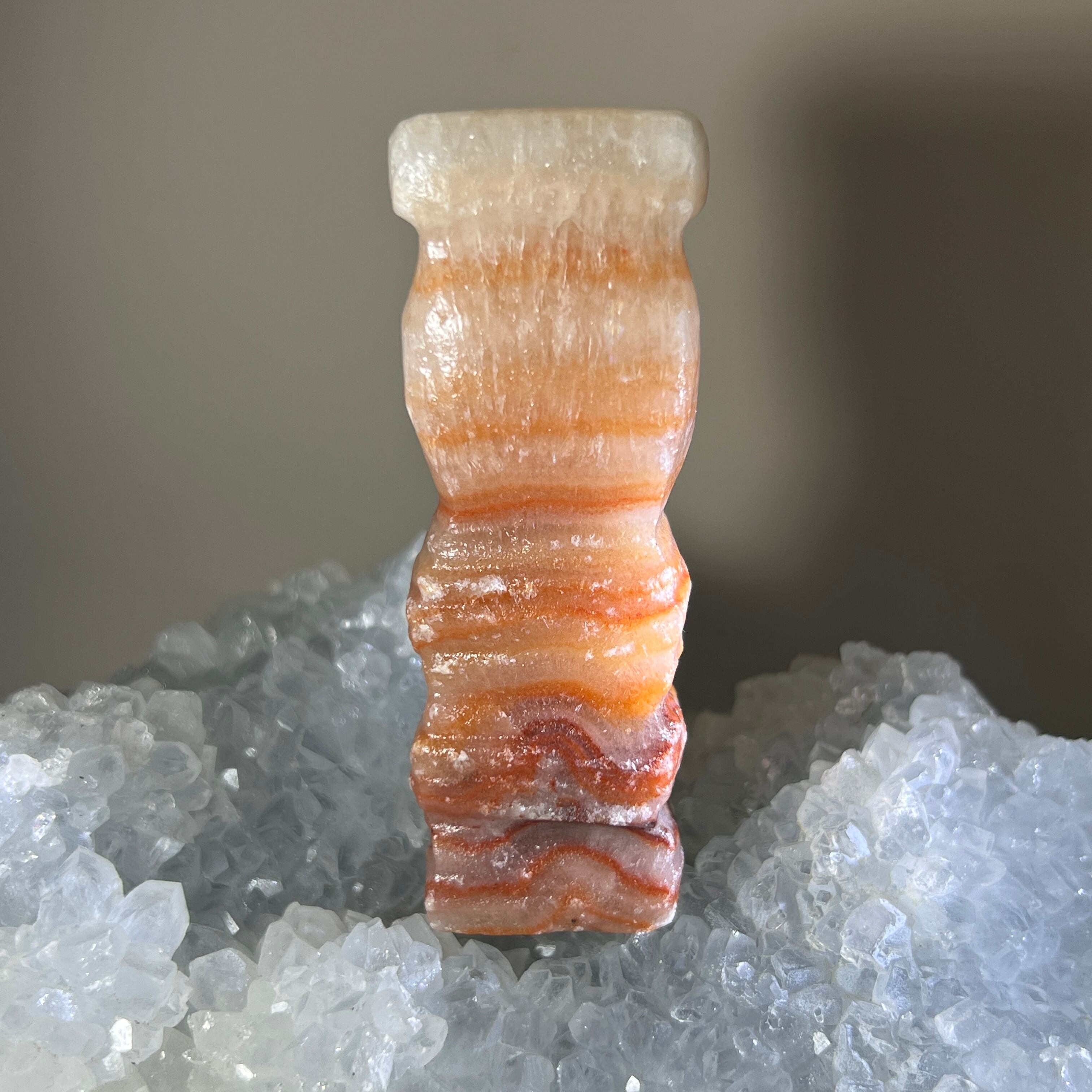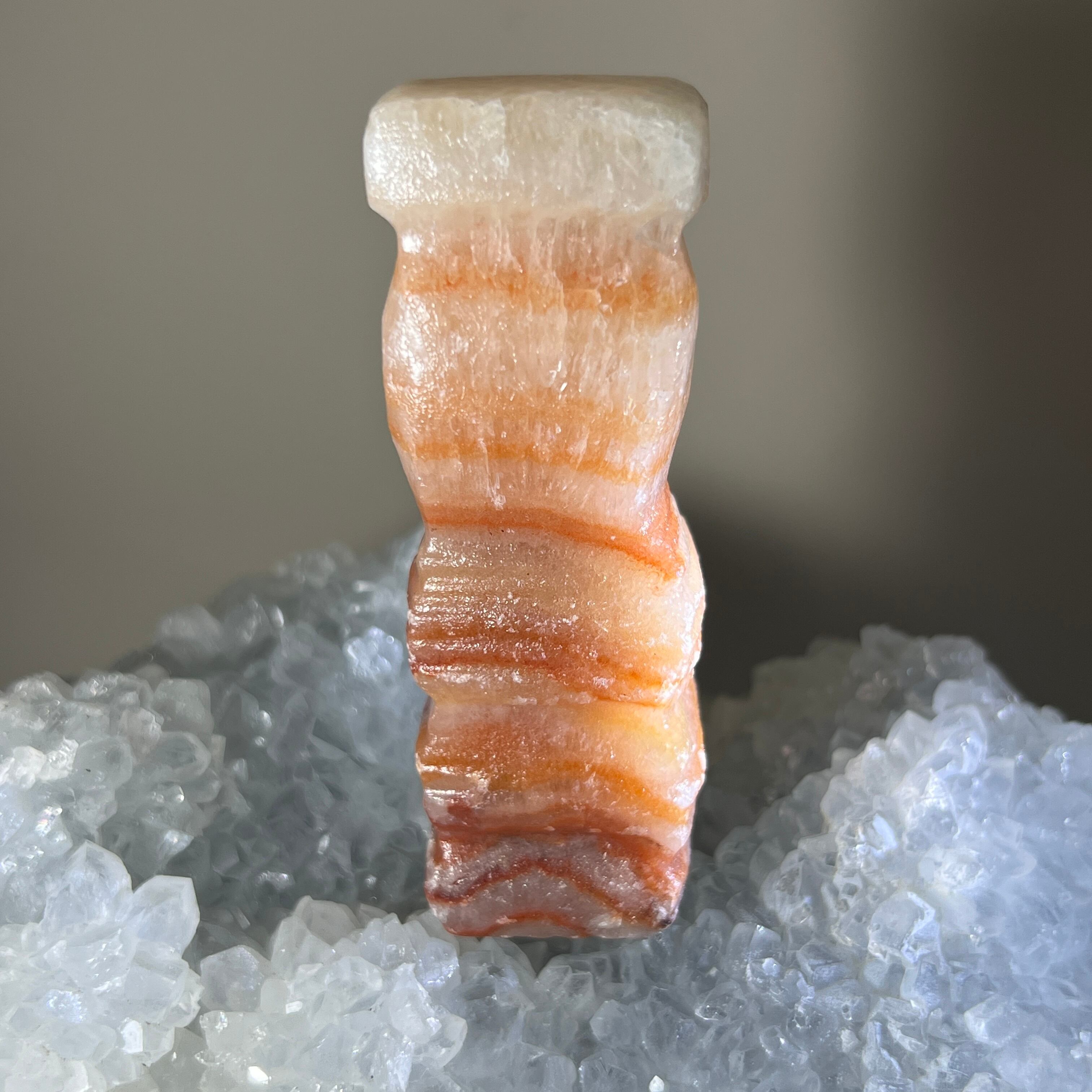 切り口に現れる層のリズムが特徴で、観賞用や装飾の石としてユニークな表情が親しまれてきました。素朴さの中に遊び心のある佇まいが魅力です。