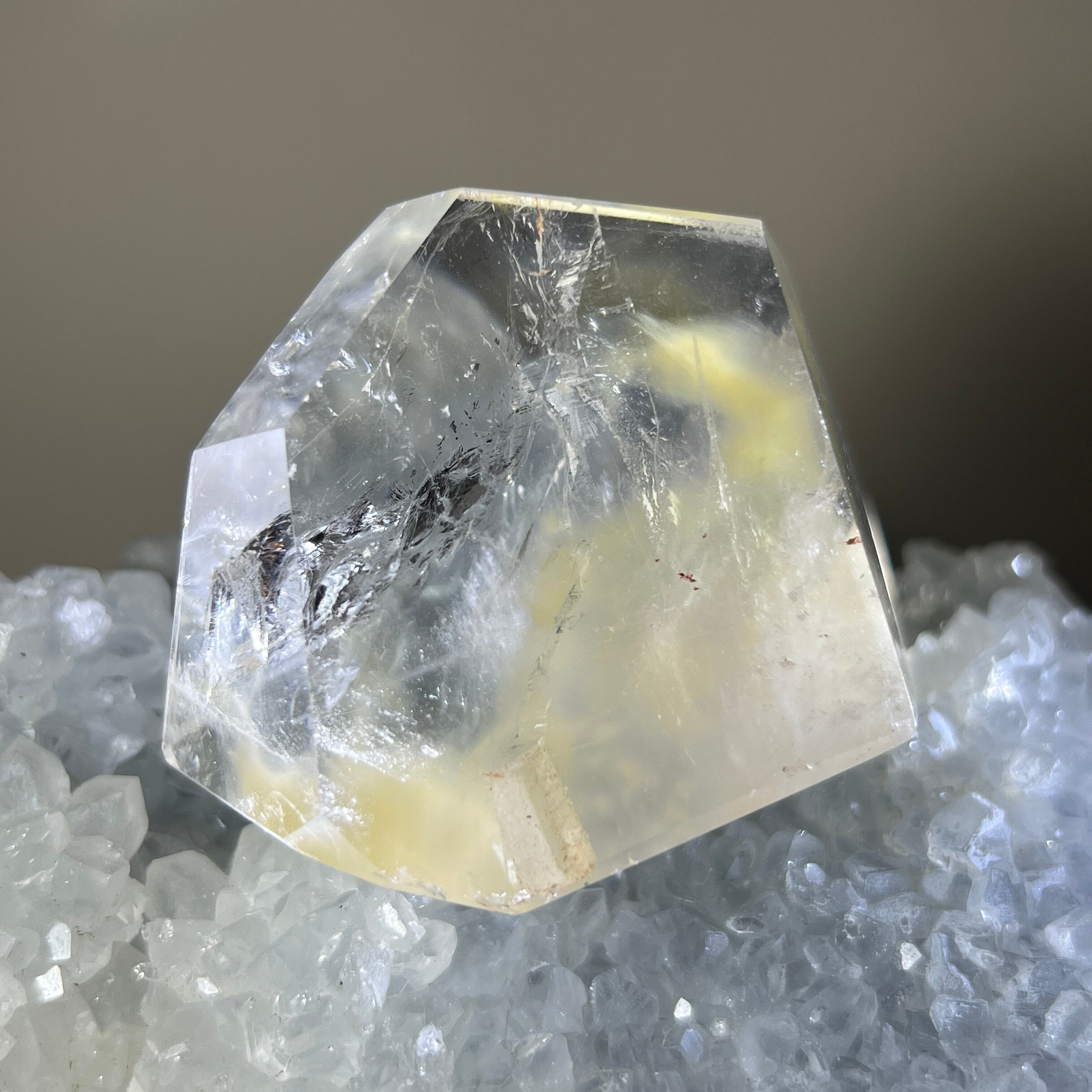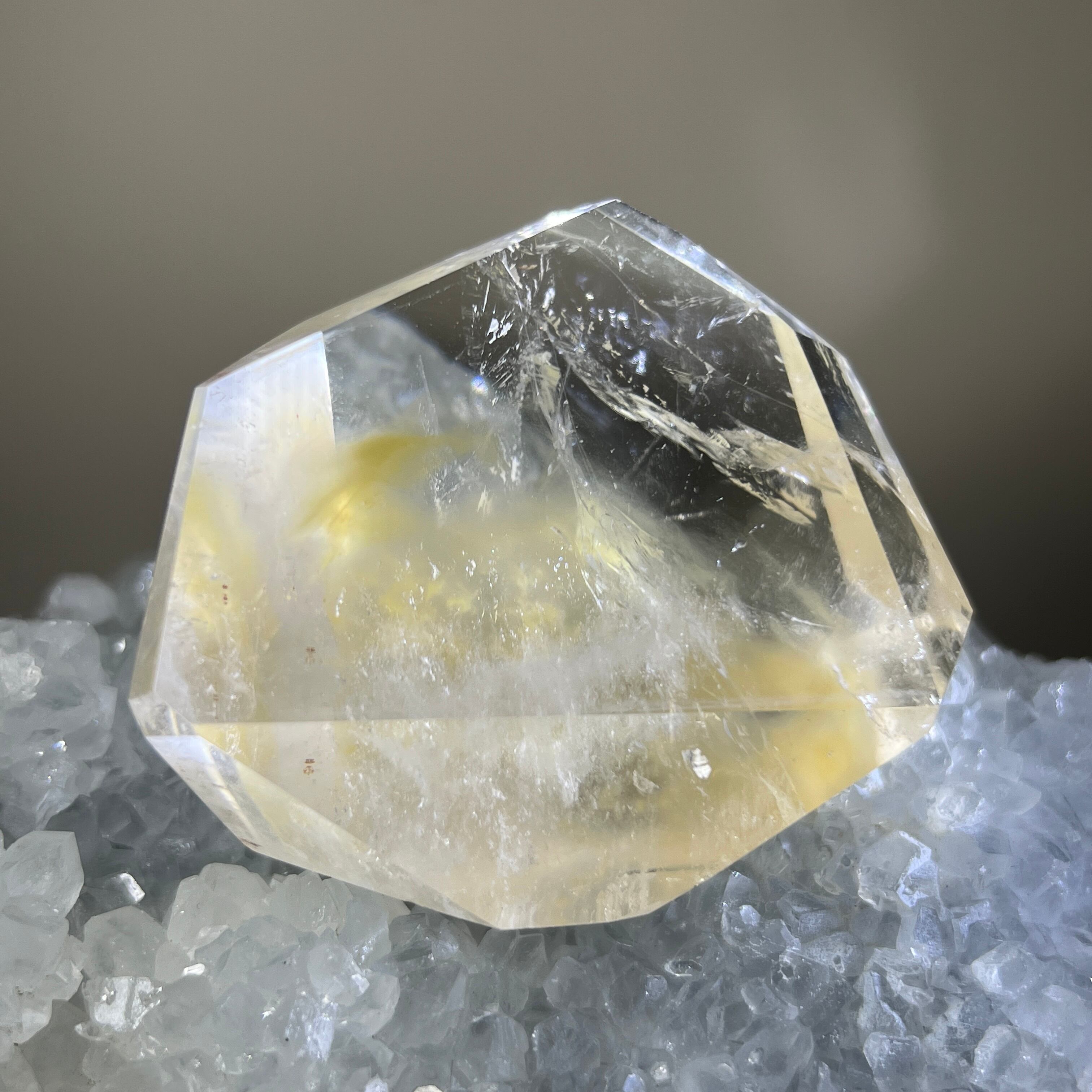 サゲニティッククオーツは、水晶の内部に細かな針状の入り込みが網目のように見えることからそう呼ばれます。イエローのタイプはやわらかな黄金色のニュアンスが特徴で、装飾やお守りとしても親しまれてきました。透明度の中を走る線が、時の積み重ねを思わせる落ち着いた佇まいです。