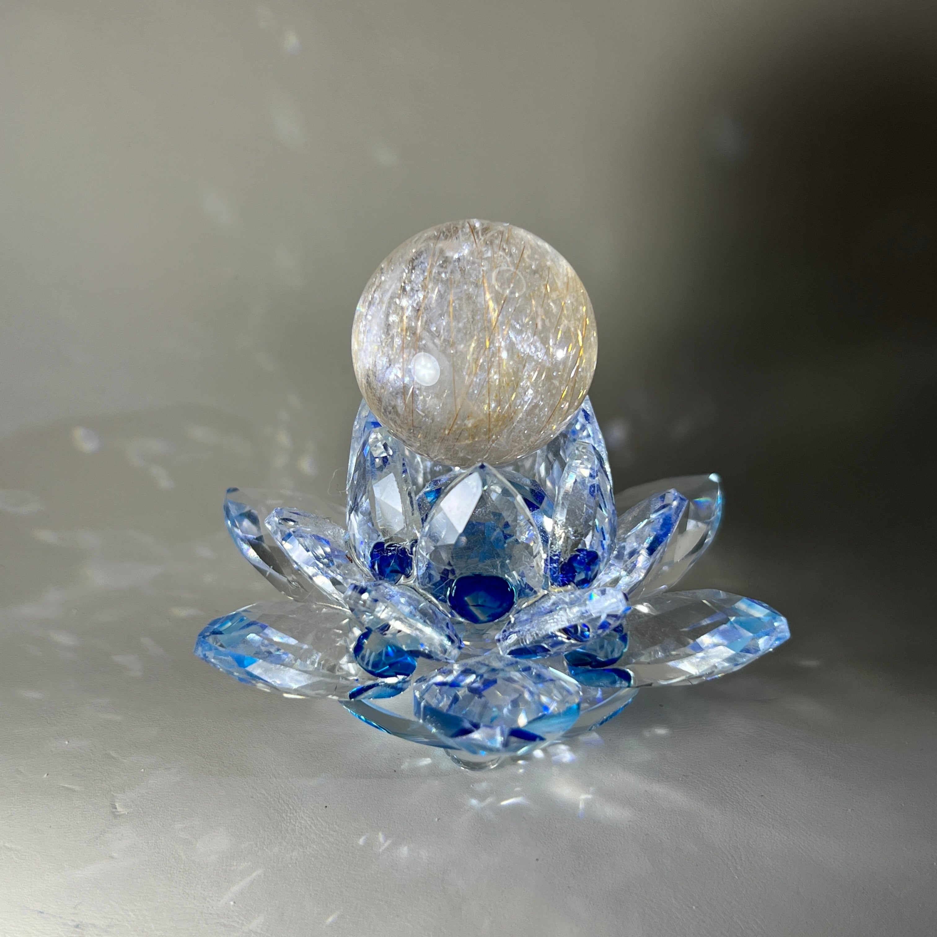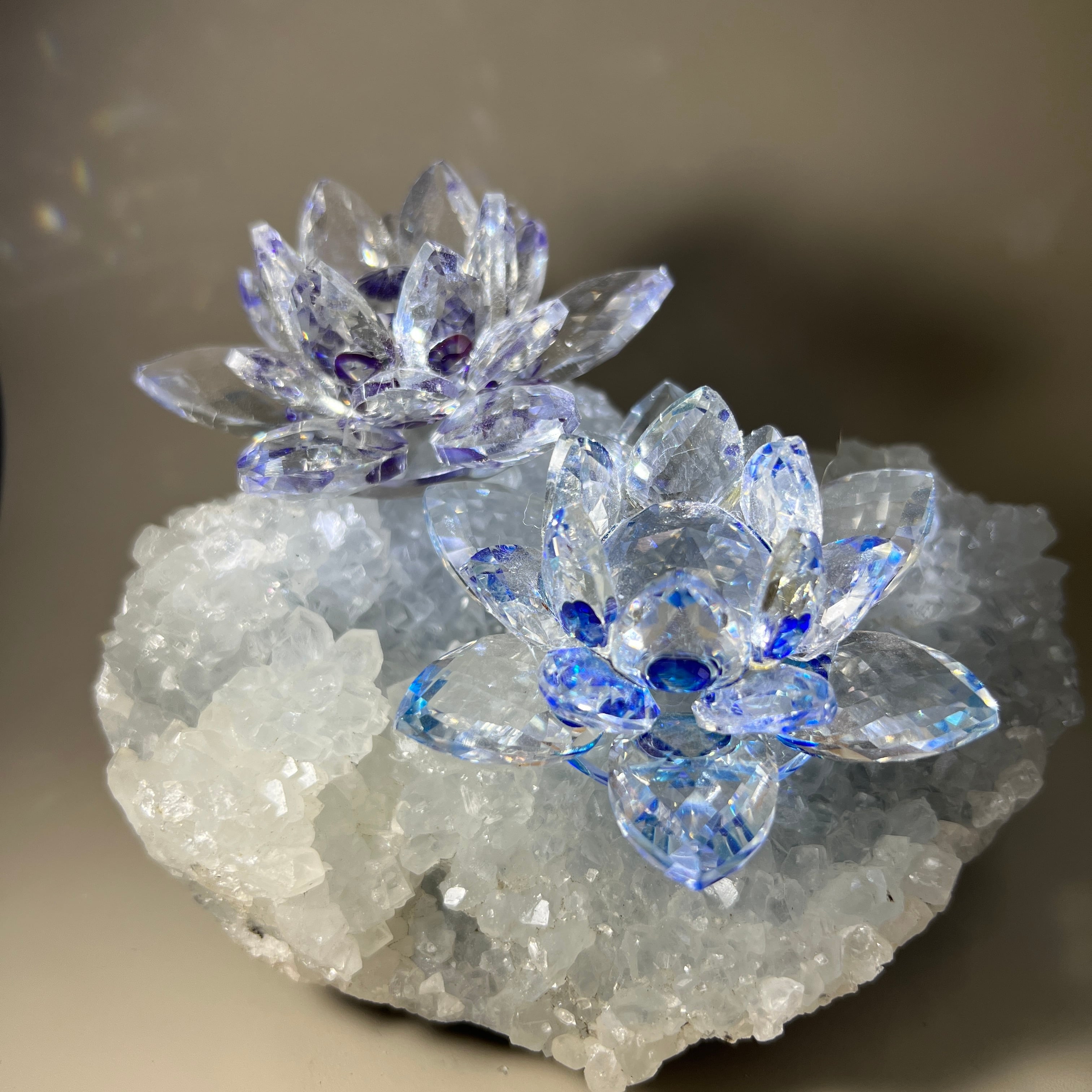 クリスタルガラスは澄んだ透明感をもつ装飾用ガラスで、光を受けると豊かな反射を見せます。“クリスタル”の語は氷を意味する古い言葉に由来し、清らかさの象徴として親しまれてきました。蓮は泥よりまっすぐに咲く花として、再生と静けさのイメージで広く用いられています。