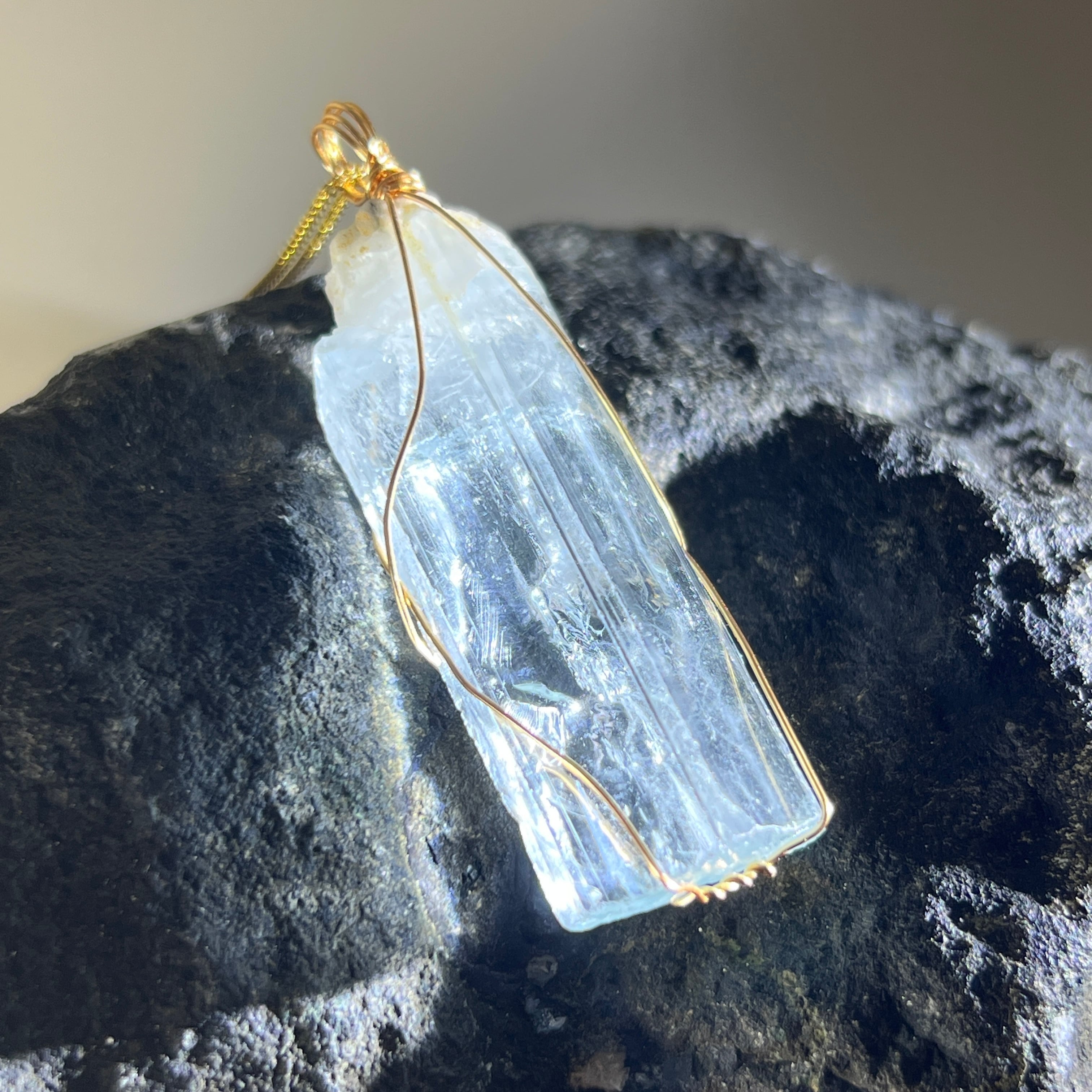 アクアマリンの名はラテン語の「海の水」に由来し、澄んだ水色が穏やかさの象徴として親しまれてきました。古くからお守りや装身具に用いられ、清らかな光をたたえる石として伝えられています。原石の風合いをいかした仕立てで、自然な表情が生きる佇まいです。