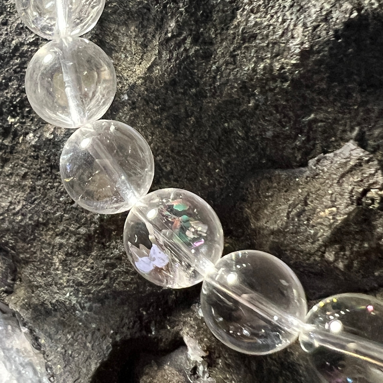 “レムリアン”の名は伝承上の大陸レムリアにちなみ、面に細かな線が見られる水晶として親しまれてきた呼び名です。光にかざすと虹が現れる表情をもつタイプは“アイリス”と呼ばれます。透明度のバランスがよく、虹がわかりやすい粒を選別しています。