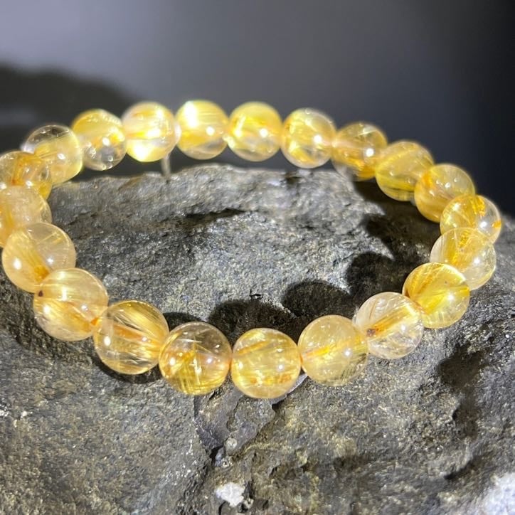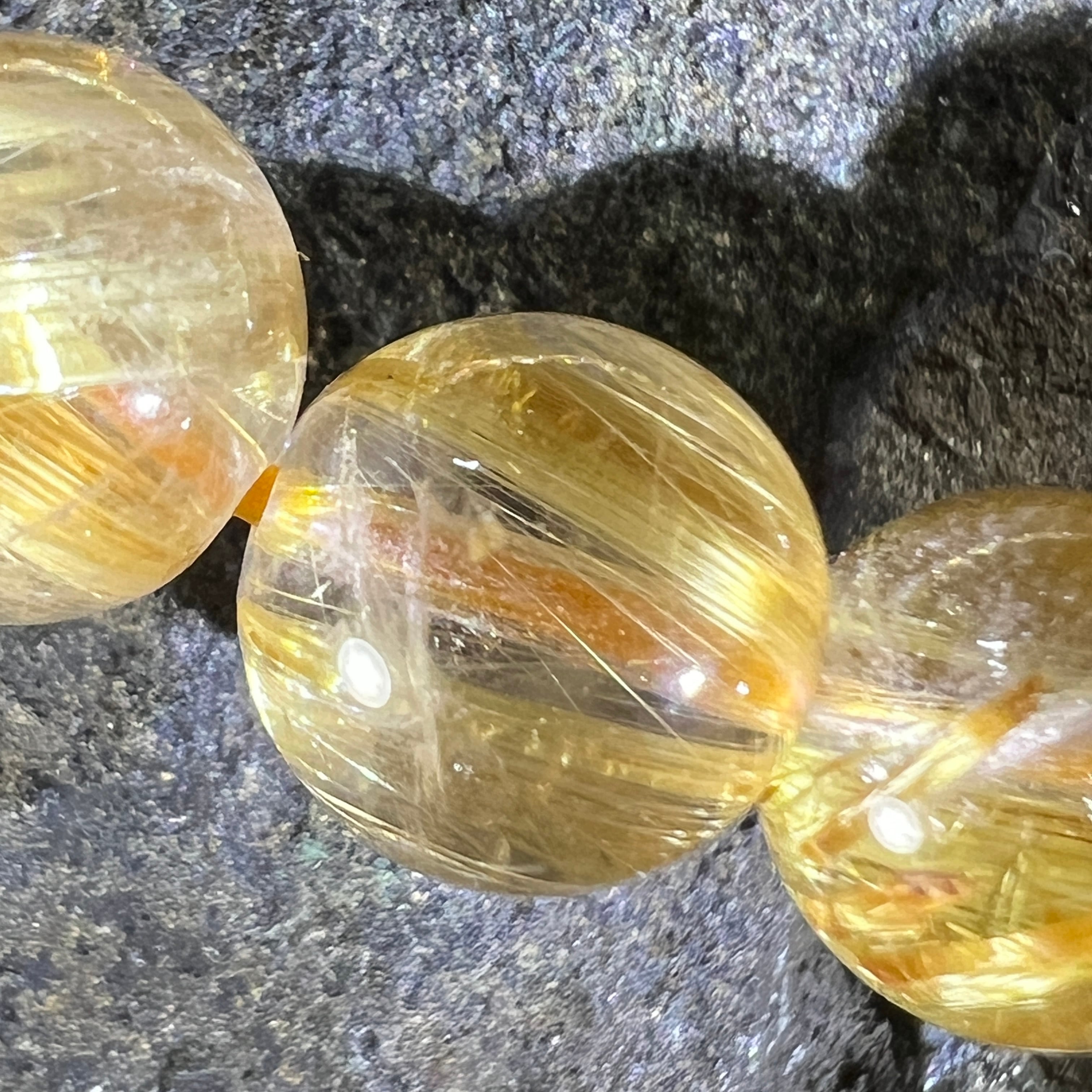 透明感のある水晶の中に金色のルチルが美しく走り、光を受けるたびに細い筋が柔らかく光ります。