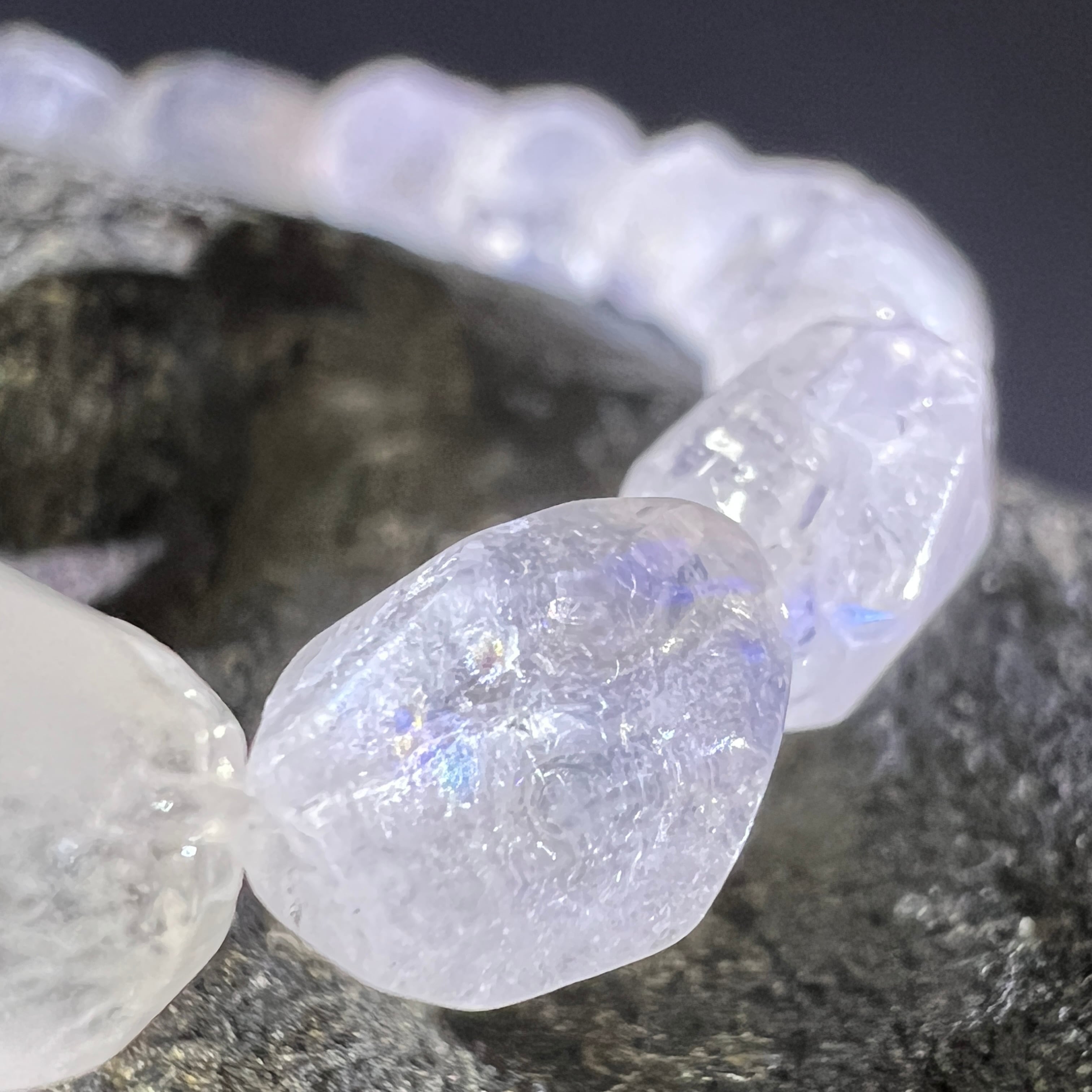 レインボームーンストーンは長石グループの天然石で、角度によって青白い光がふわりと走るのが特徴です。