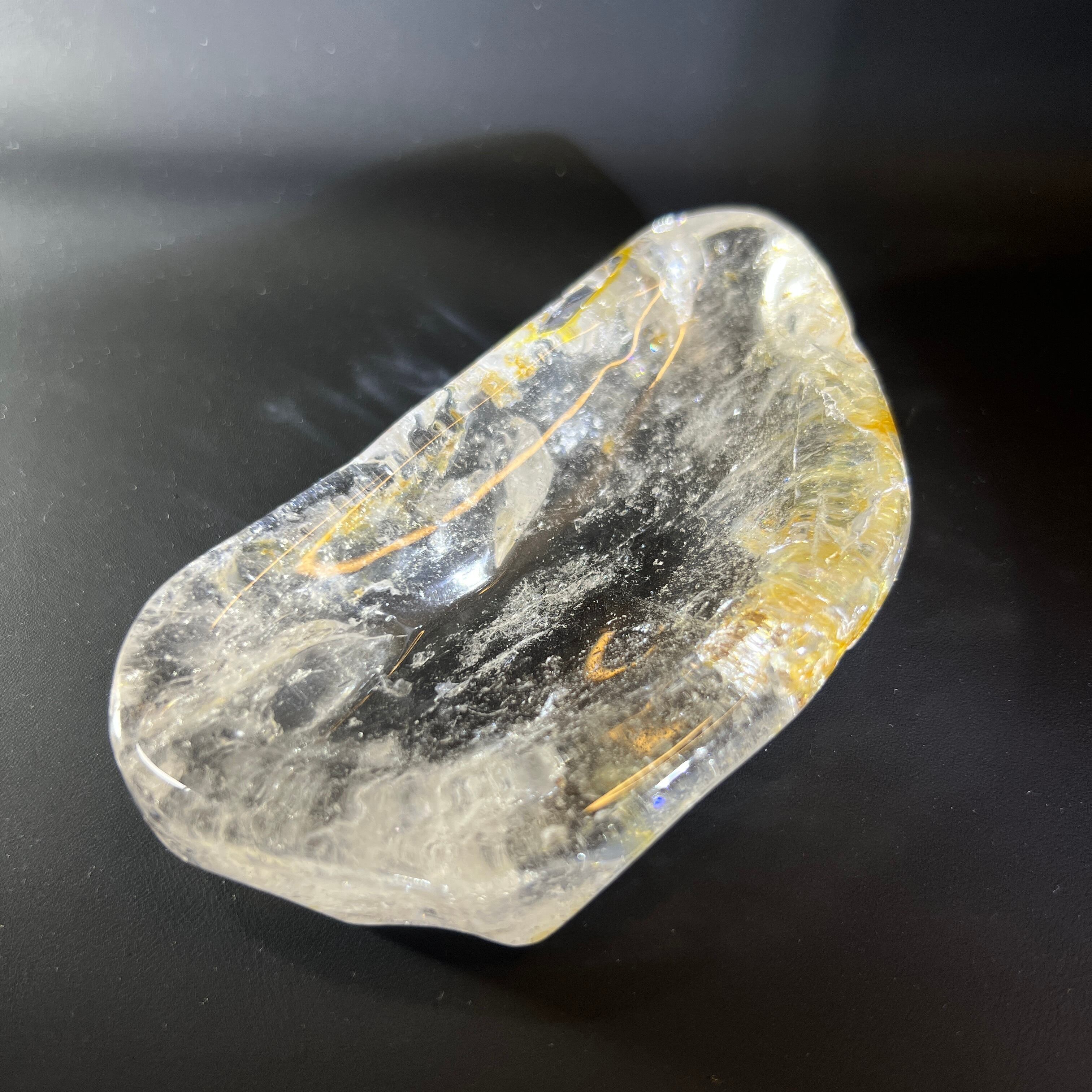 透明度の高い水晶に、ライモナイトが共生したお皿型の原石です。