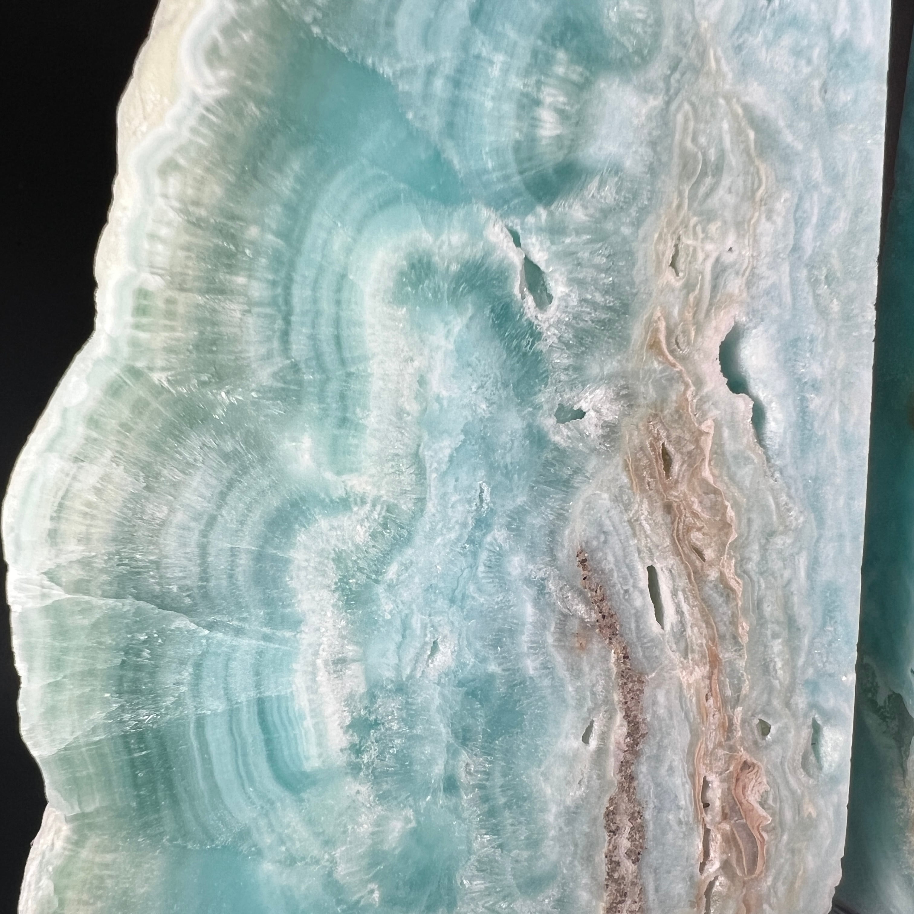 ヘミモルファイトは、やさしい青〜ミント色の結晶が集まってできる天然石です。感情の波を静め、前向きな気持ちへ切り替えるイメージで親しまれています。スライスならではの面が広く、模様の流れをじっくり味わえます。