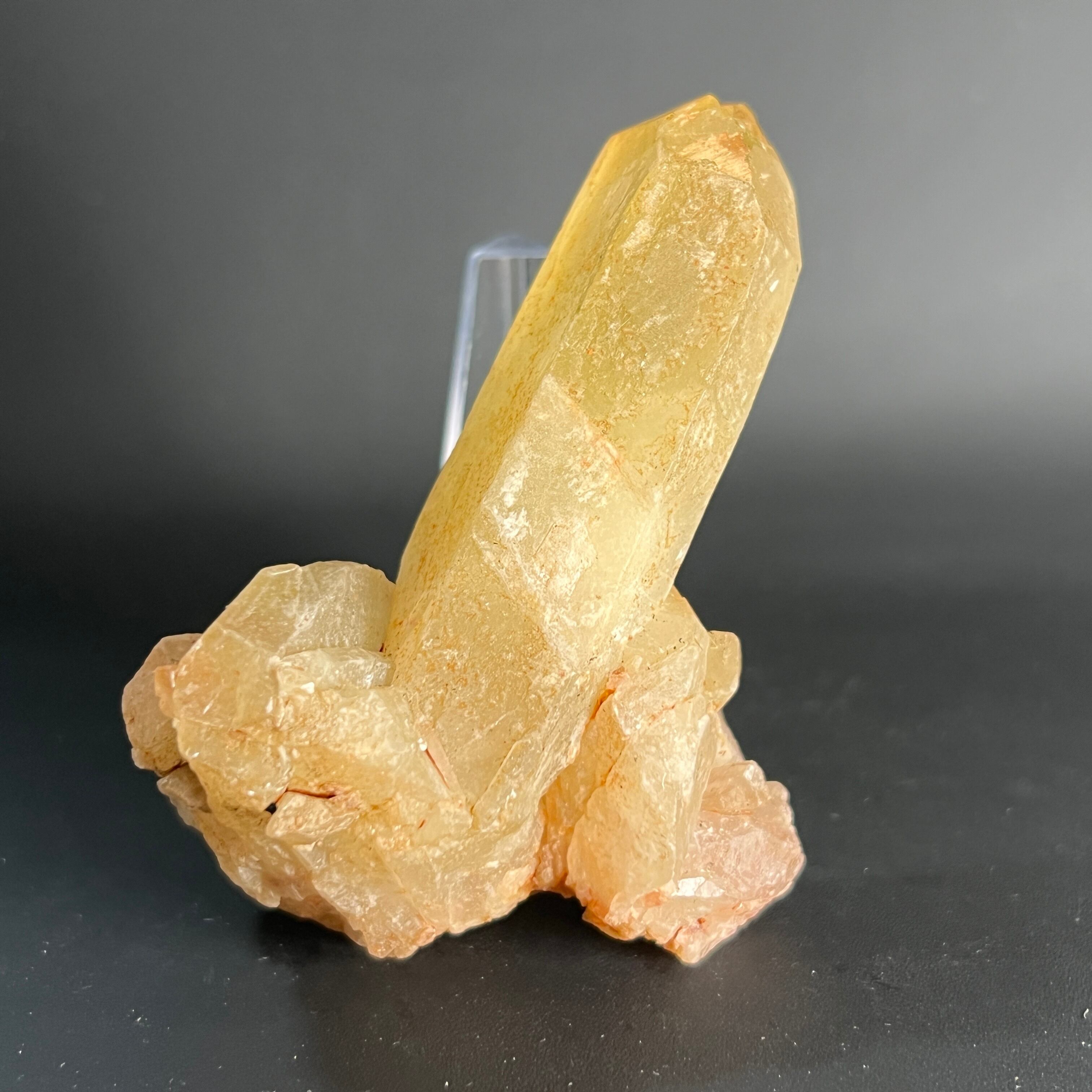 一本すっと伸びる主結晶が、オベリスクのように凛とした印象を与え、周りの結晶が放射状に重なって力強い佇まいです。