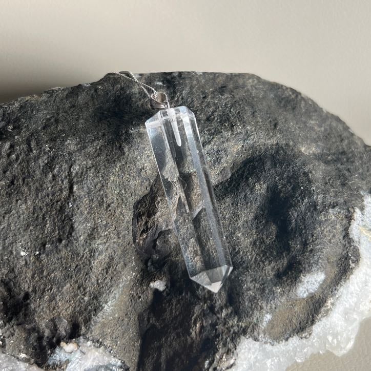 透明度のバランスが美しい水晶ポイントを、ワイヤーでやさしく包んだネックレスです。