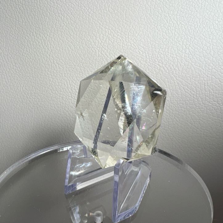 内部に広がる光の反射がやわらかい虹を生み、落ち着いた光沢と透明度のバランスが魅力です。