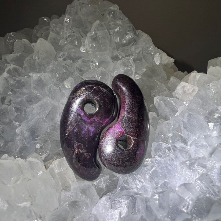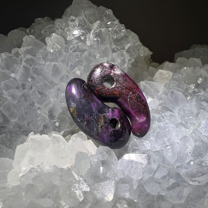 深い紫の層が重なり合い、内側から静かな輝きを湧き上がらせるスギライトの勾玉です。