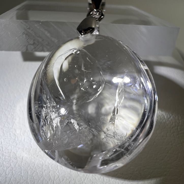 透明度の高い水晶の内部に、静かに宿る水のゆらぎを感じられるペンダントトップです。