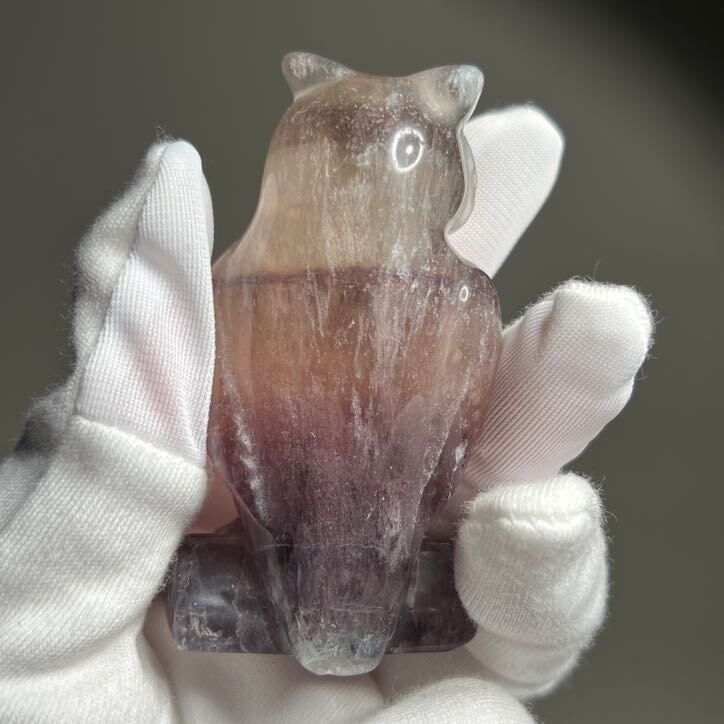 フローライトをふくろうの姿にかたどった、落ち着いた光沢が印象的な一点です。
