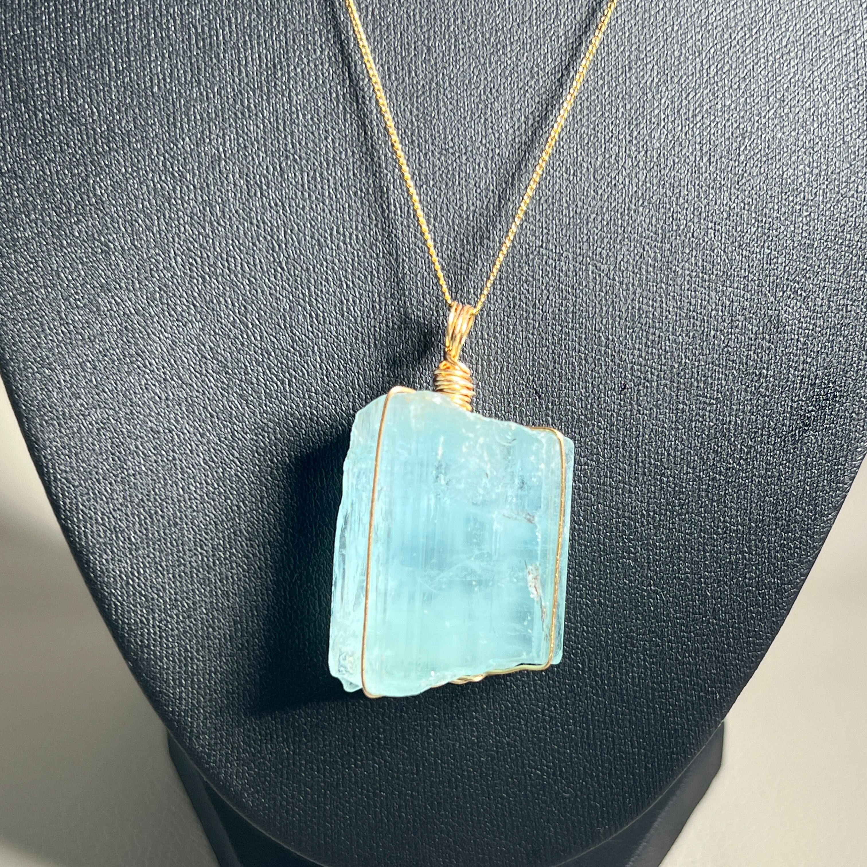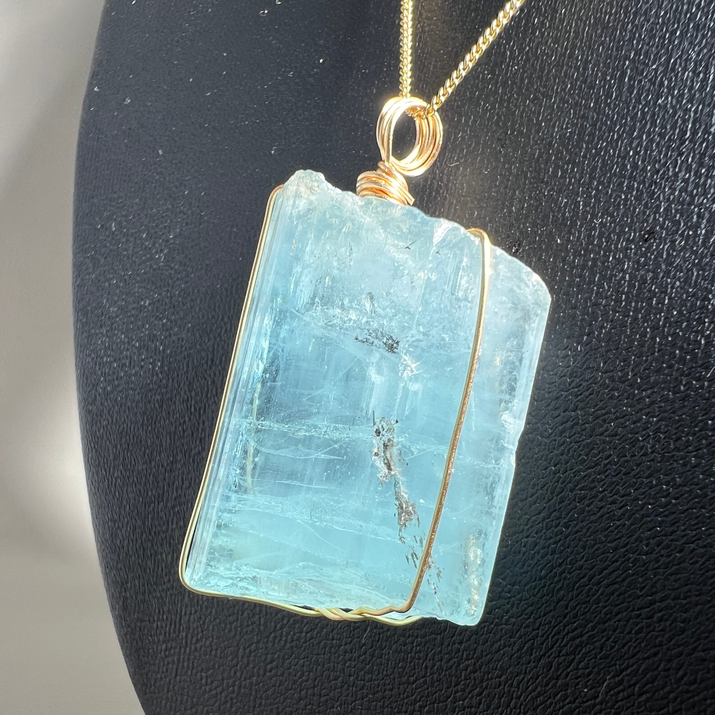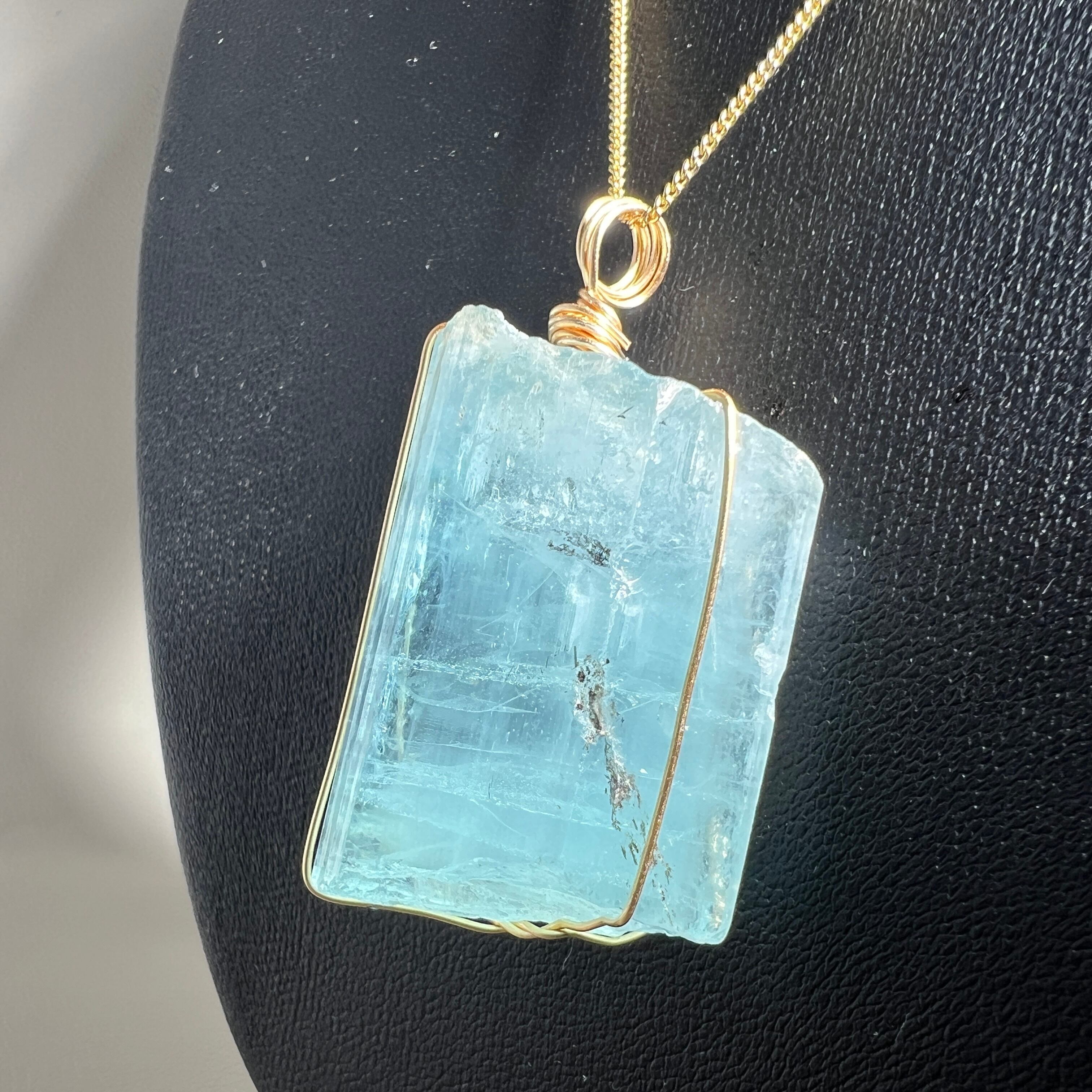 海の光を閉じ込めたような淡いブルーが印象的な、アクアマリン原石のペンダントです。
