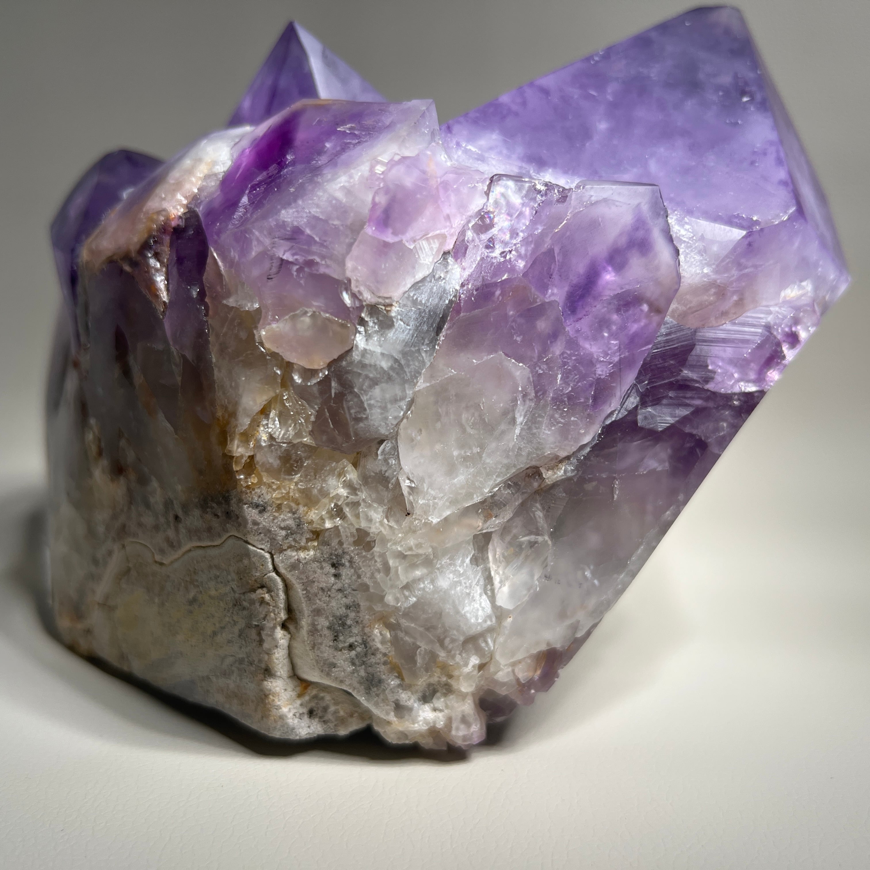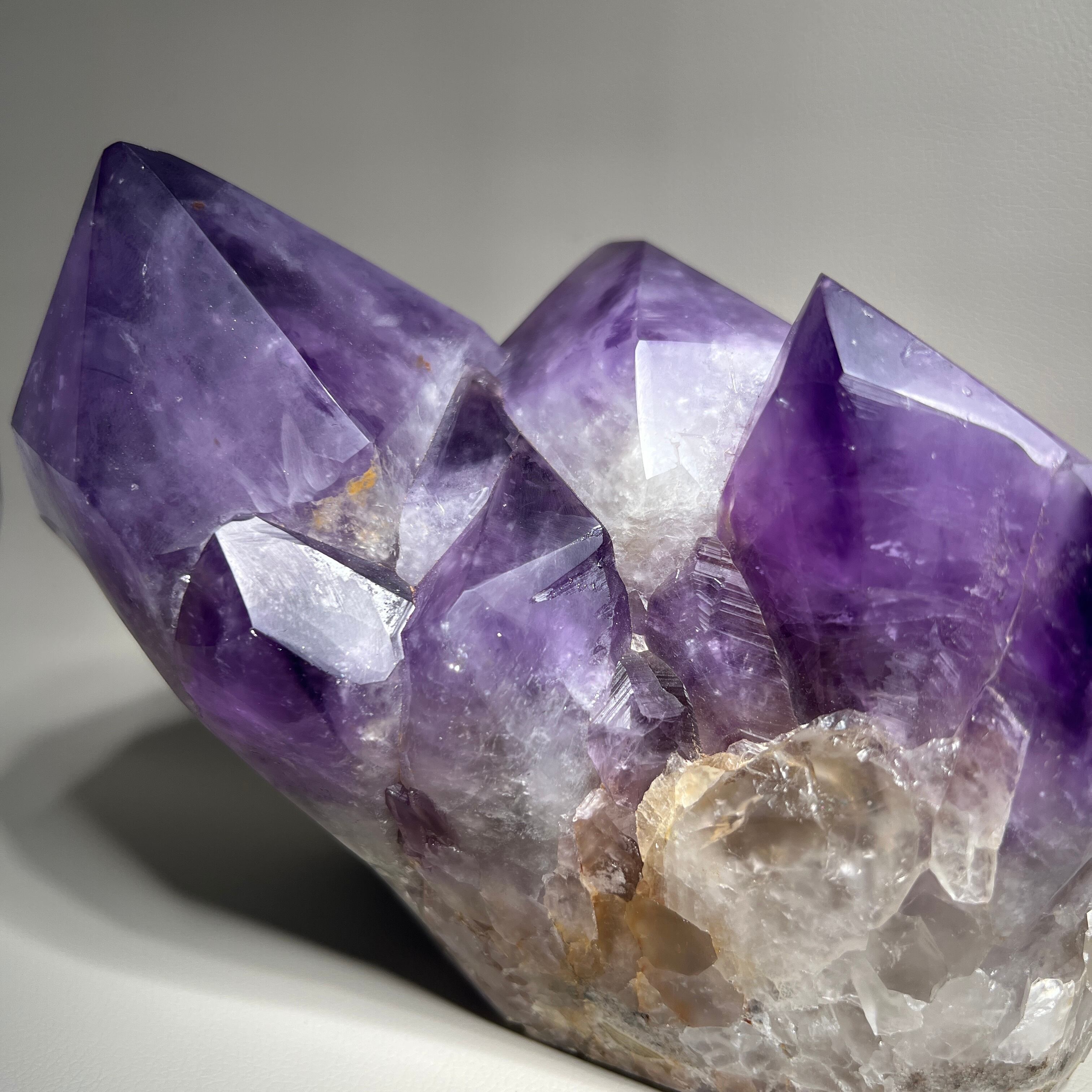 濃淡のある紫が層のように重なり、複数のポイントが立ち上がったアメジストです。