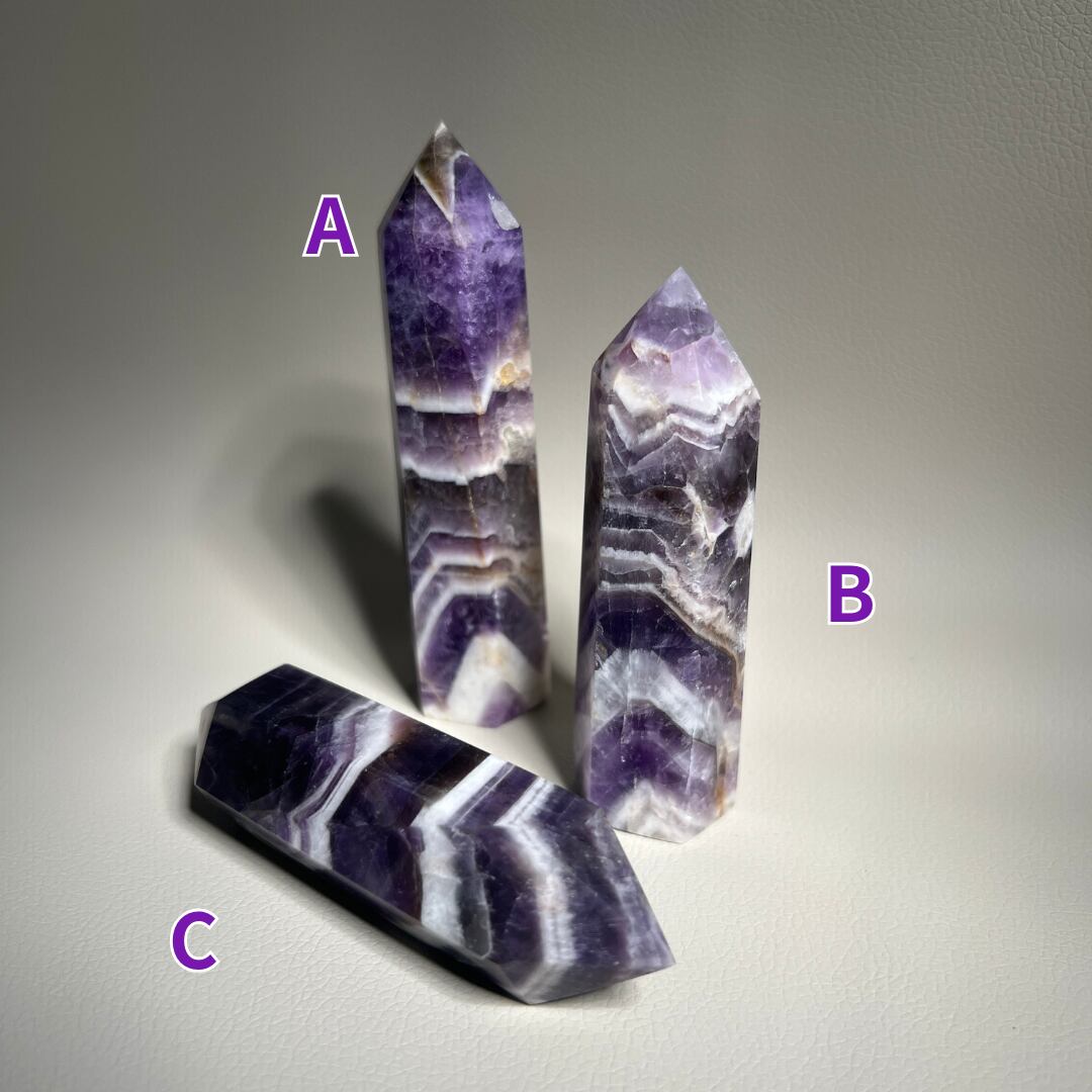 紫の深みと、白い層が描くリズムが印象的なケープアメジストのポイントです。