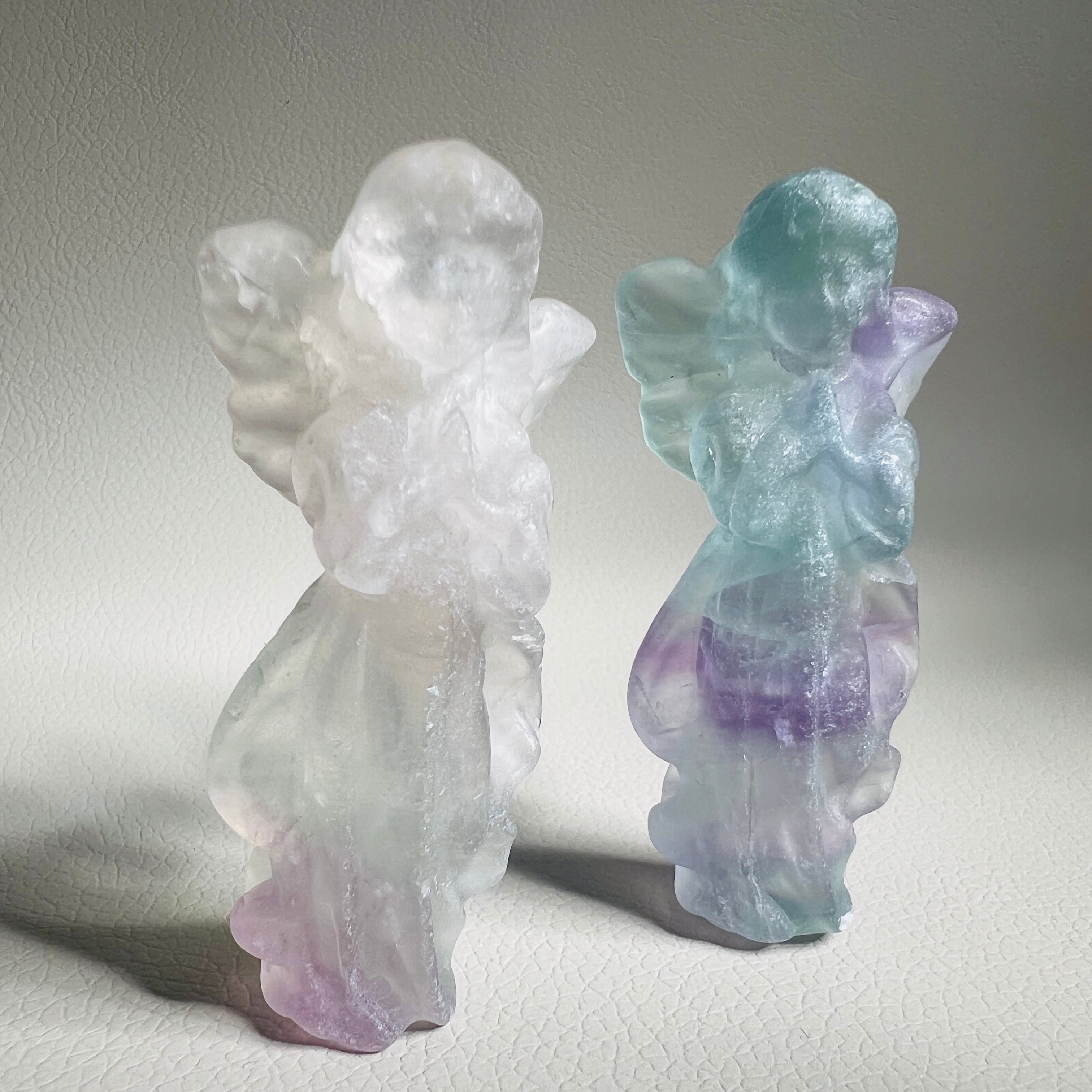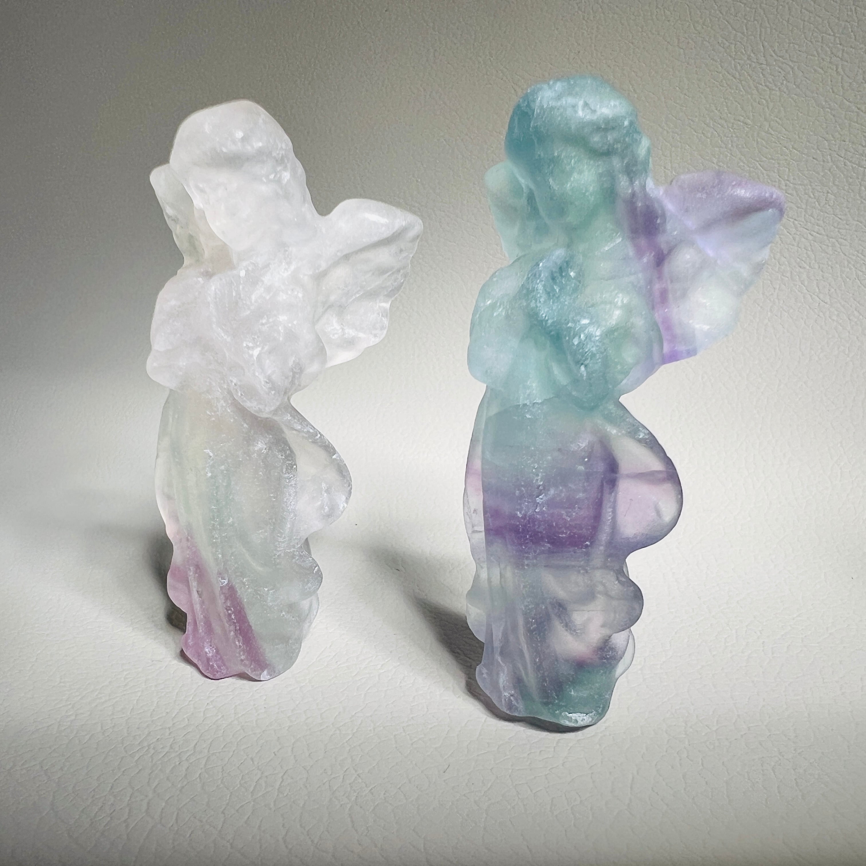 グリーンやパープルの層がやさしく重なり、透明度のバランスが心地よいフローライトのエンジェルです。