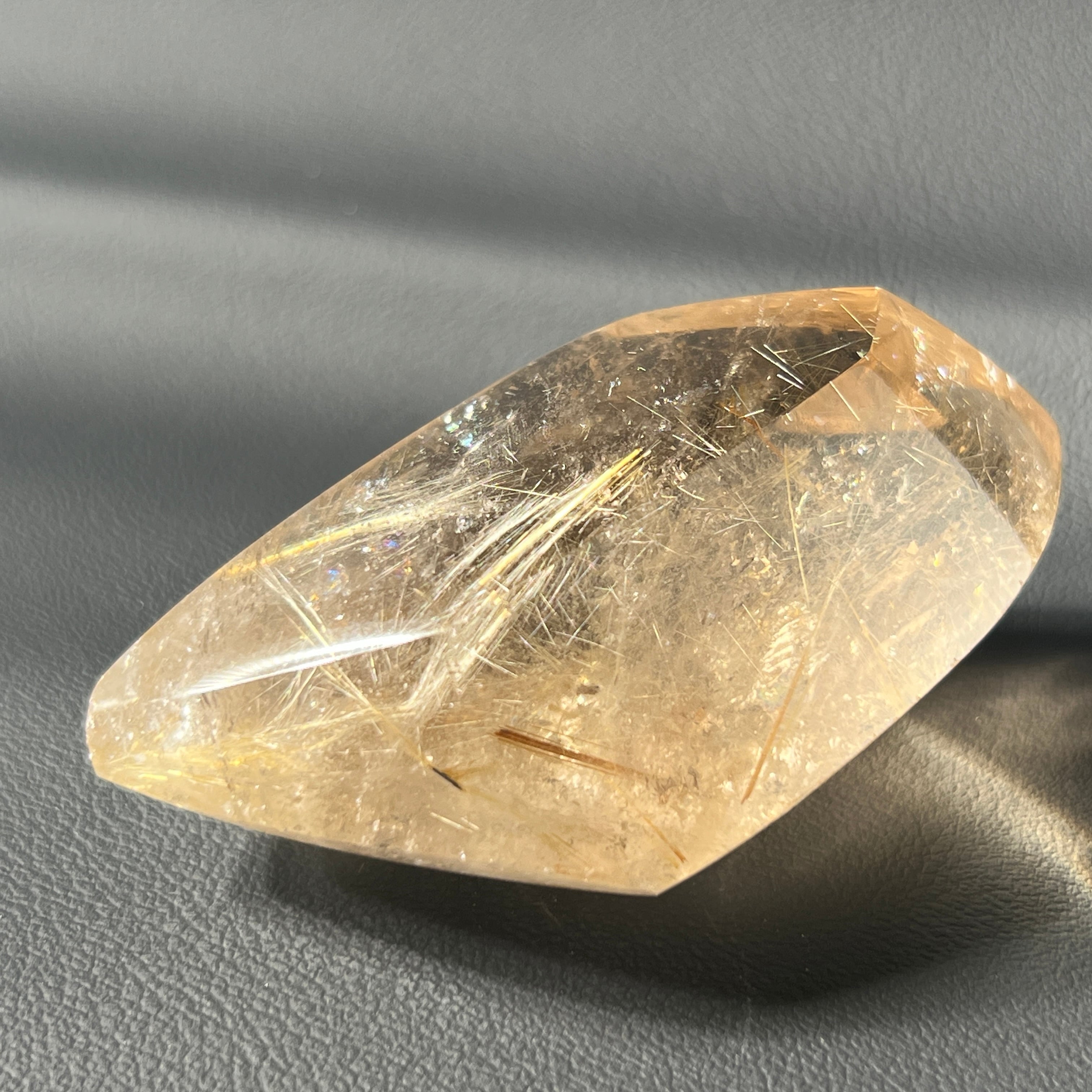 透明感のある水晶の中に、金色の針が走るルチルクォーツのフリーカットです。