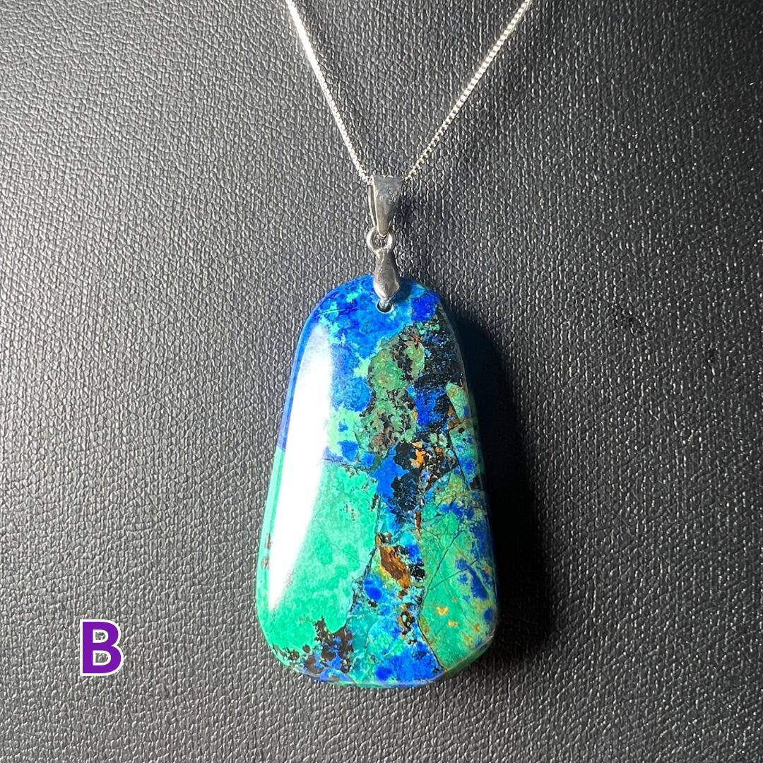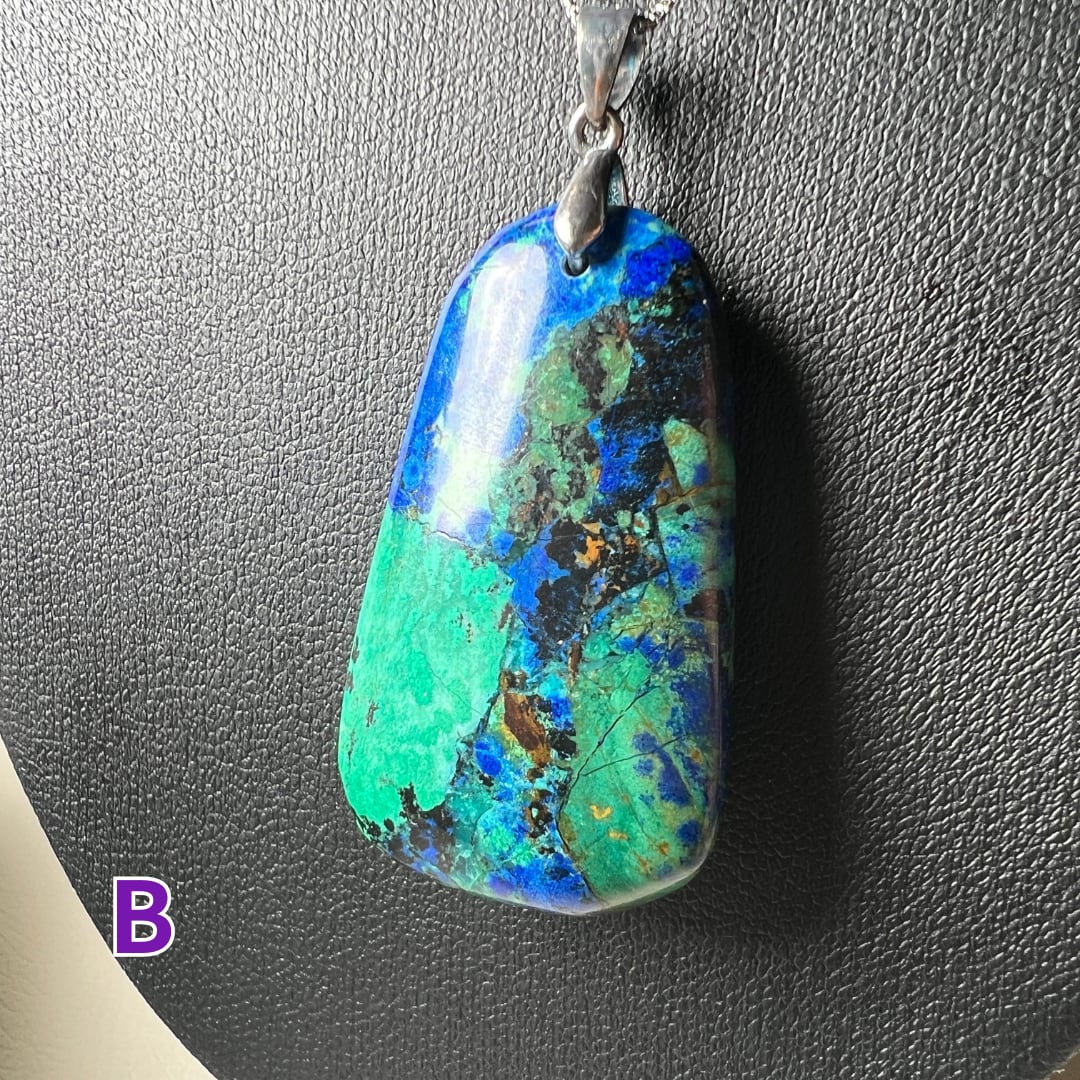 深い群青のアズライトと、青緑のクリソコラが一つの景色のように溶け合った共生ストーンです。