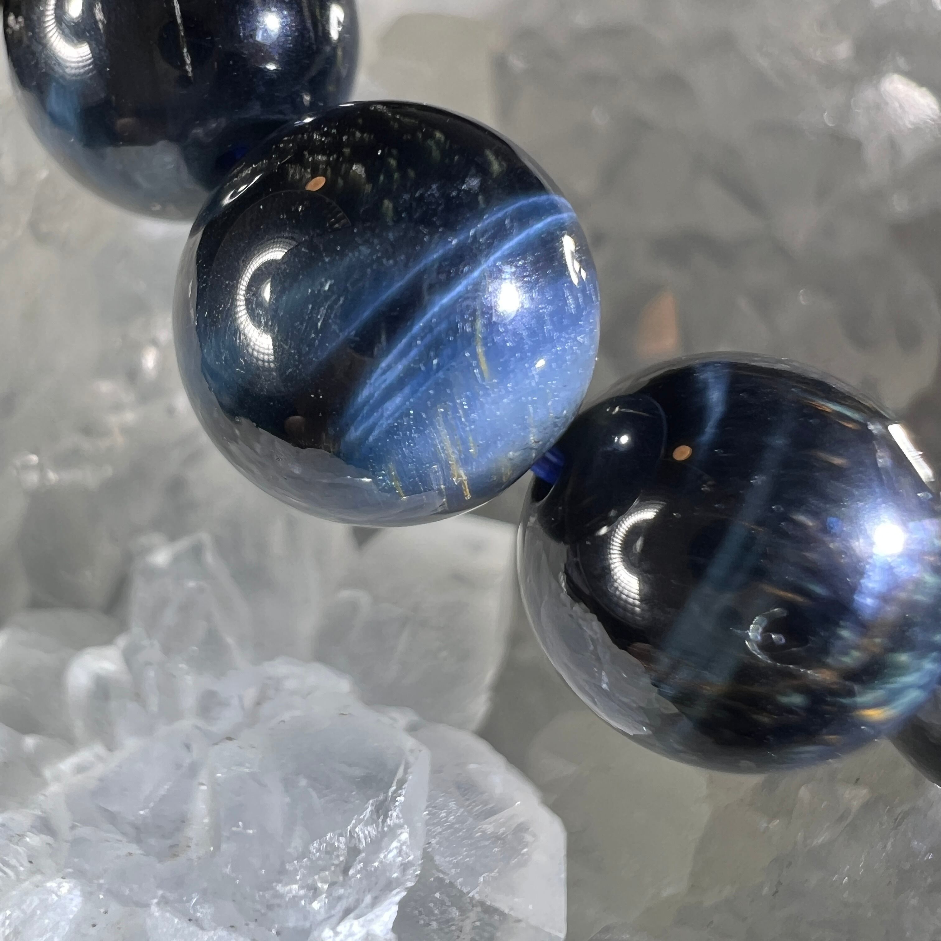 深いネイビーの中に、光の筋がすっと走るブルータイガーアイのブレスレットです。