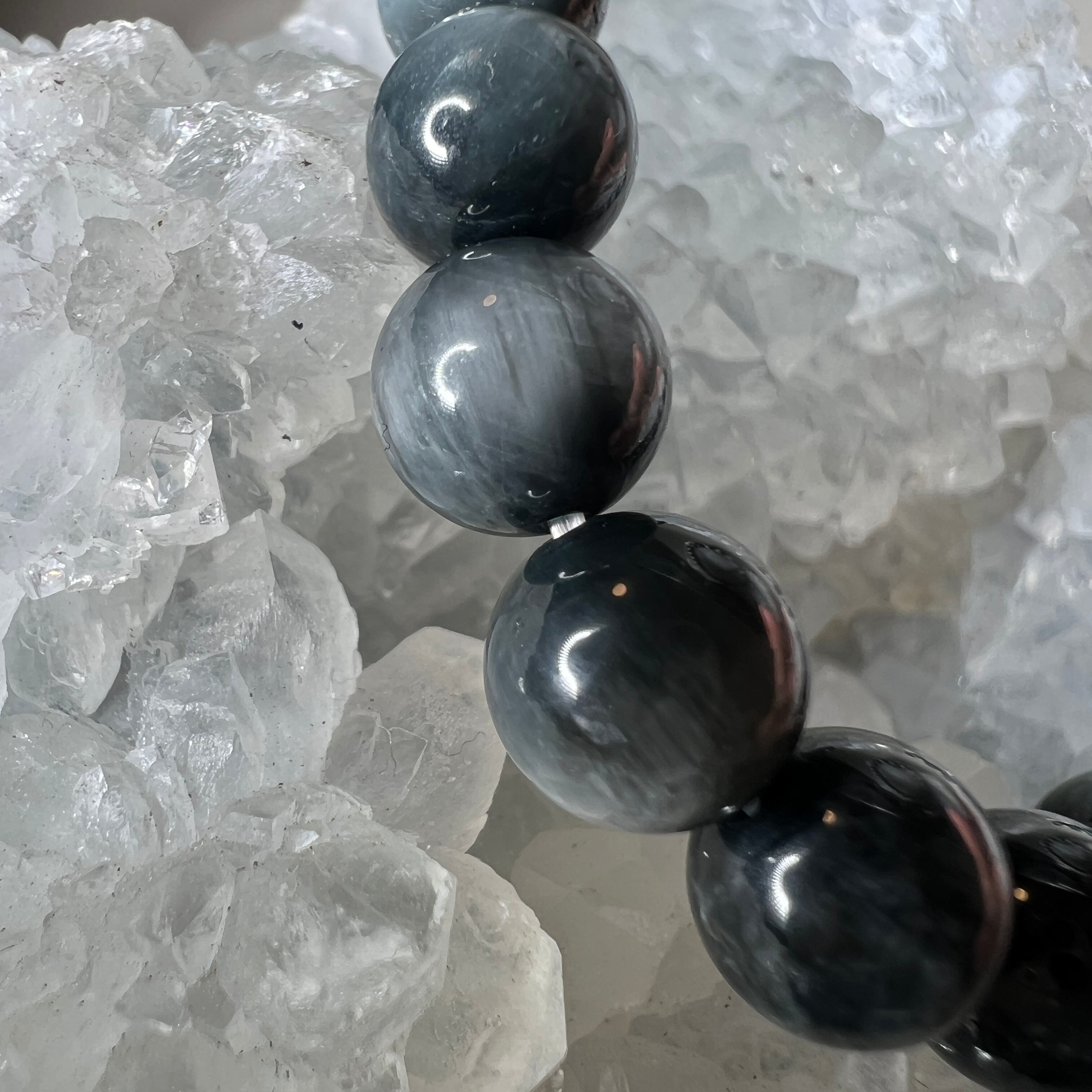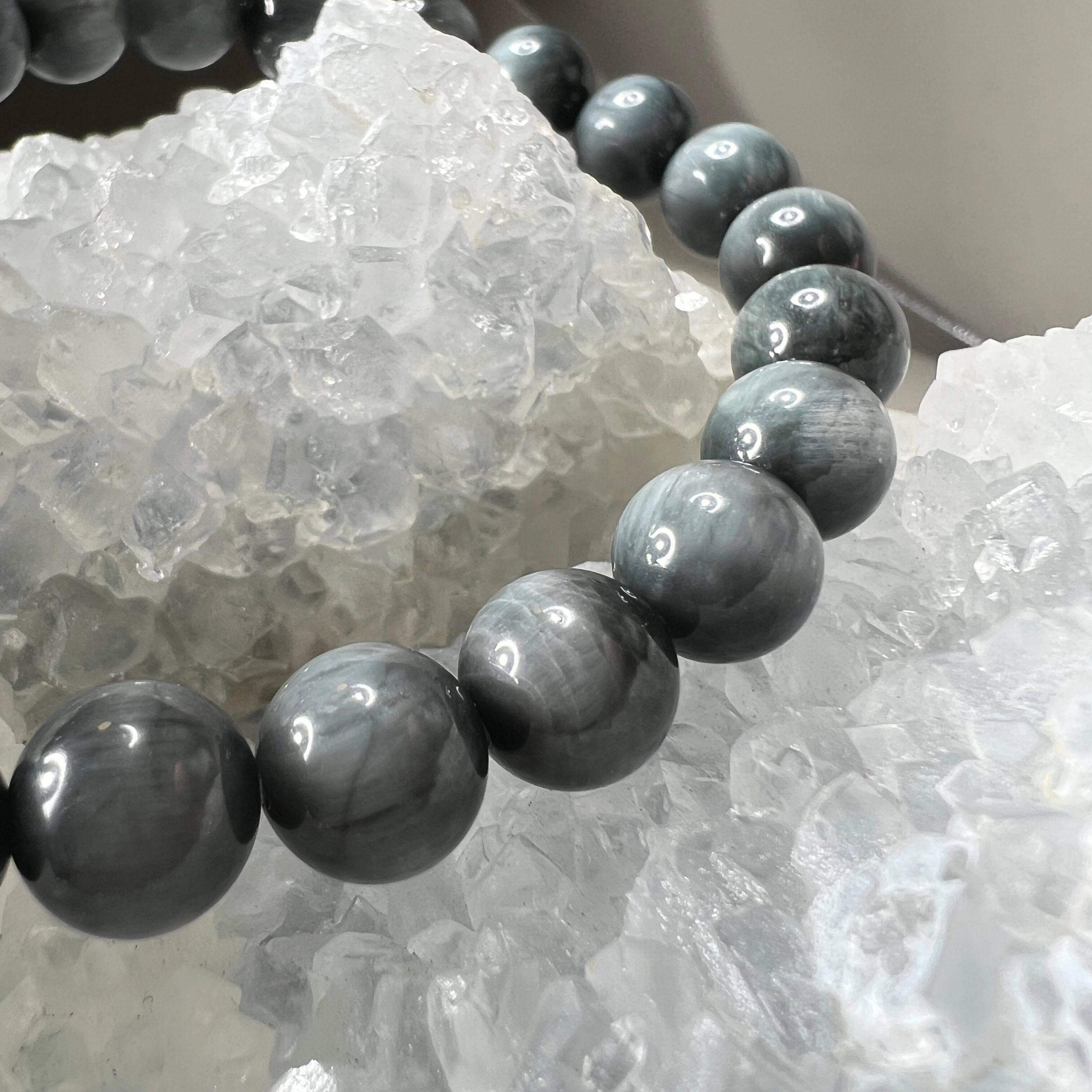 深いグレーに青みの光が走るイーグルアイを連ねた、静かな存在感のブレスレットです。