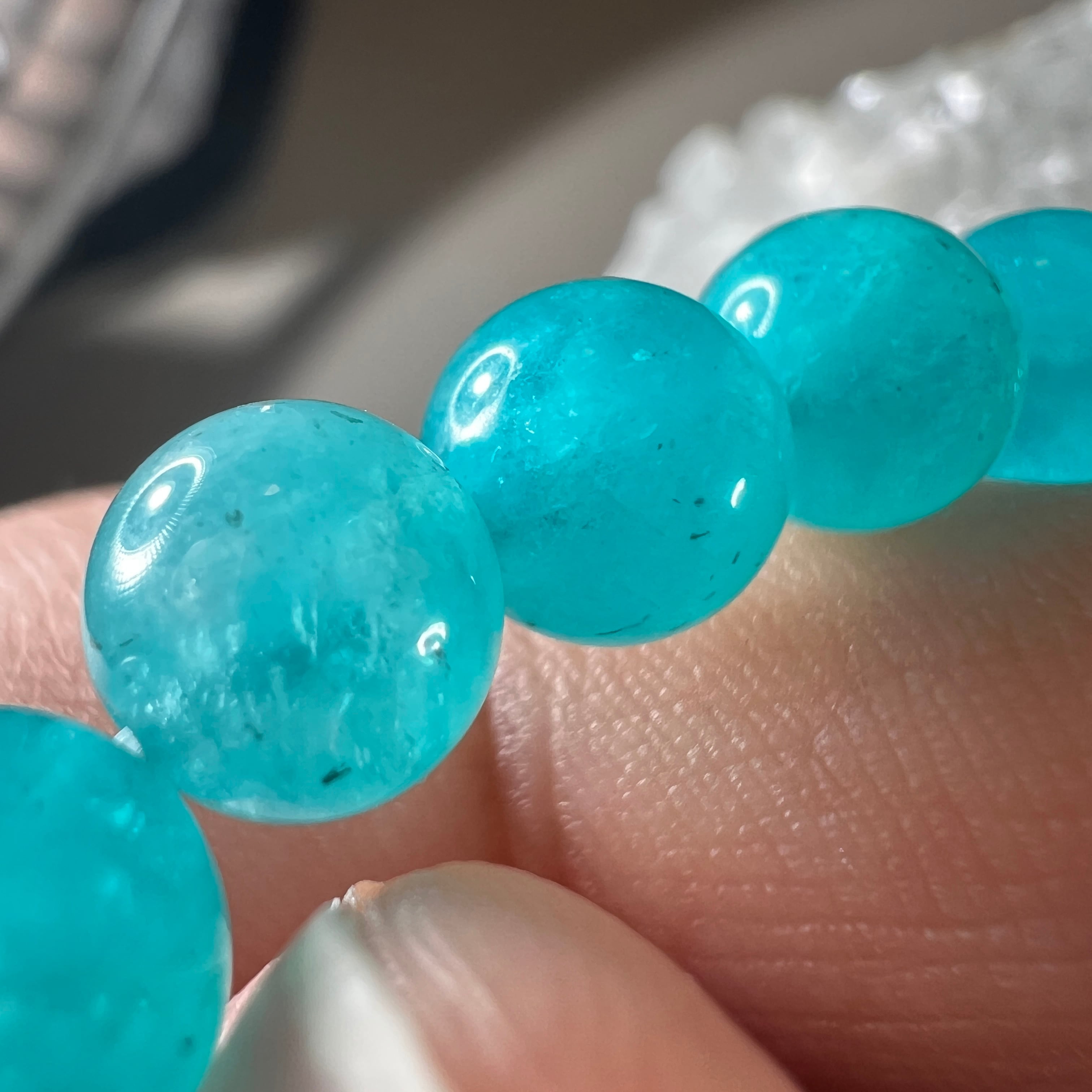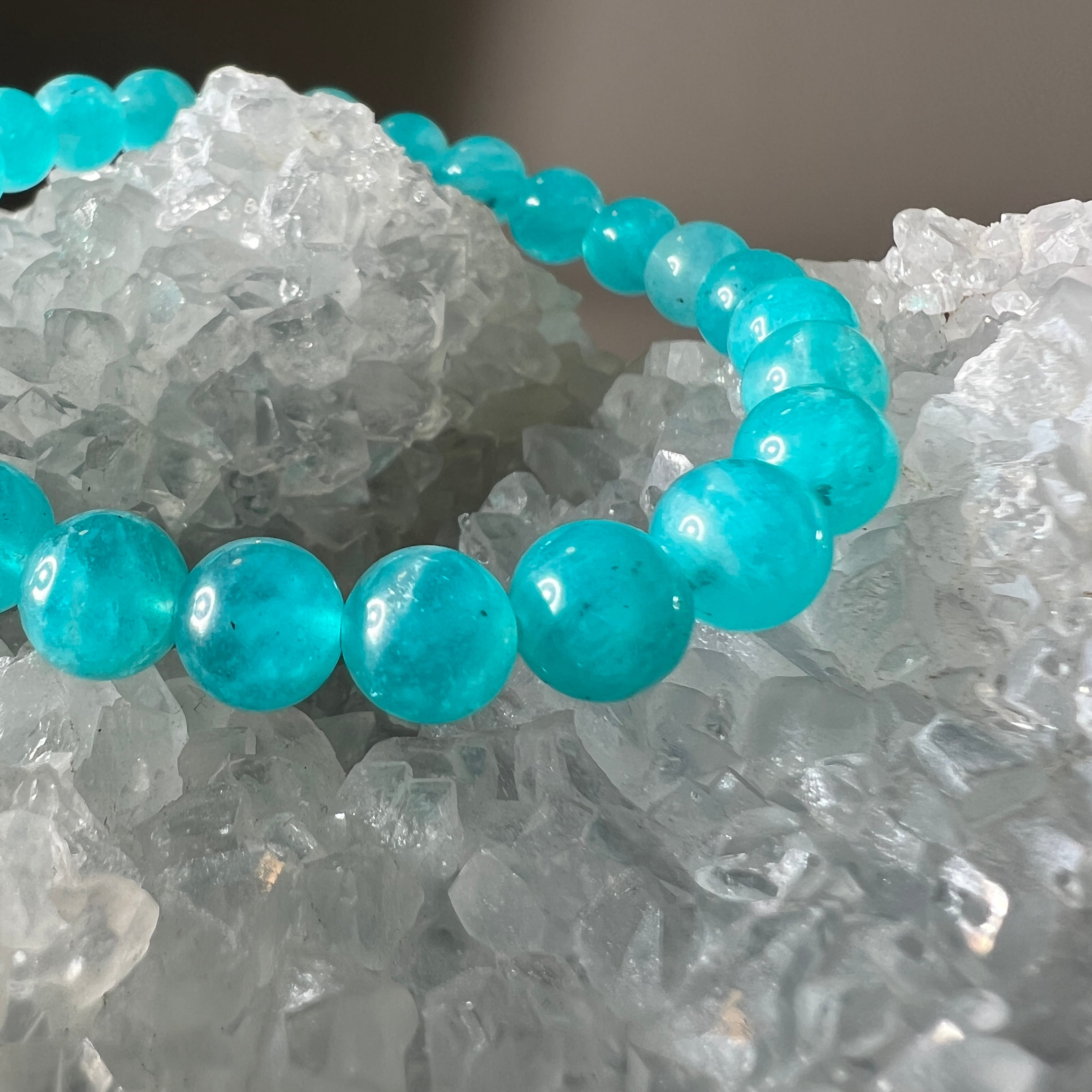 澄んだ青緑が印象的なアマゾナイトを、7mmで軽やかに仕立てたブレスレットです。