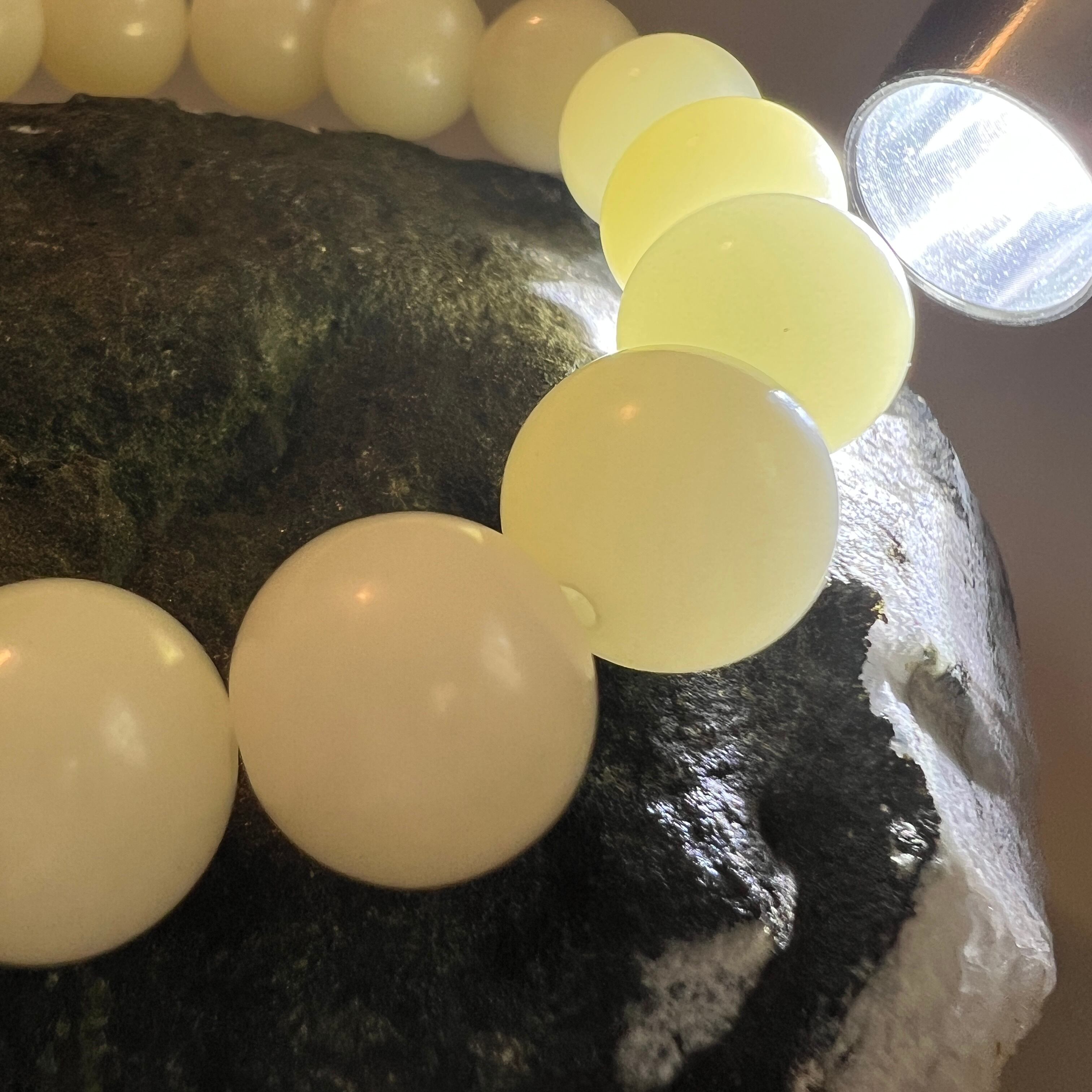 ミルキーでやさしい色合いの12mm珠に、ころんと可愛い“肉球”モチーフを添えた、癒し系お守りブレスレット。