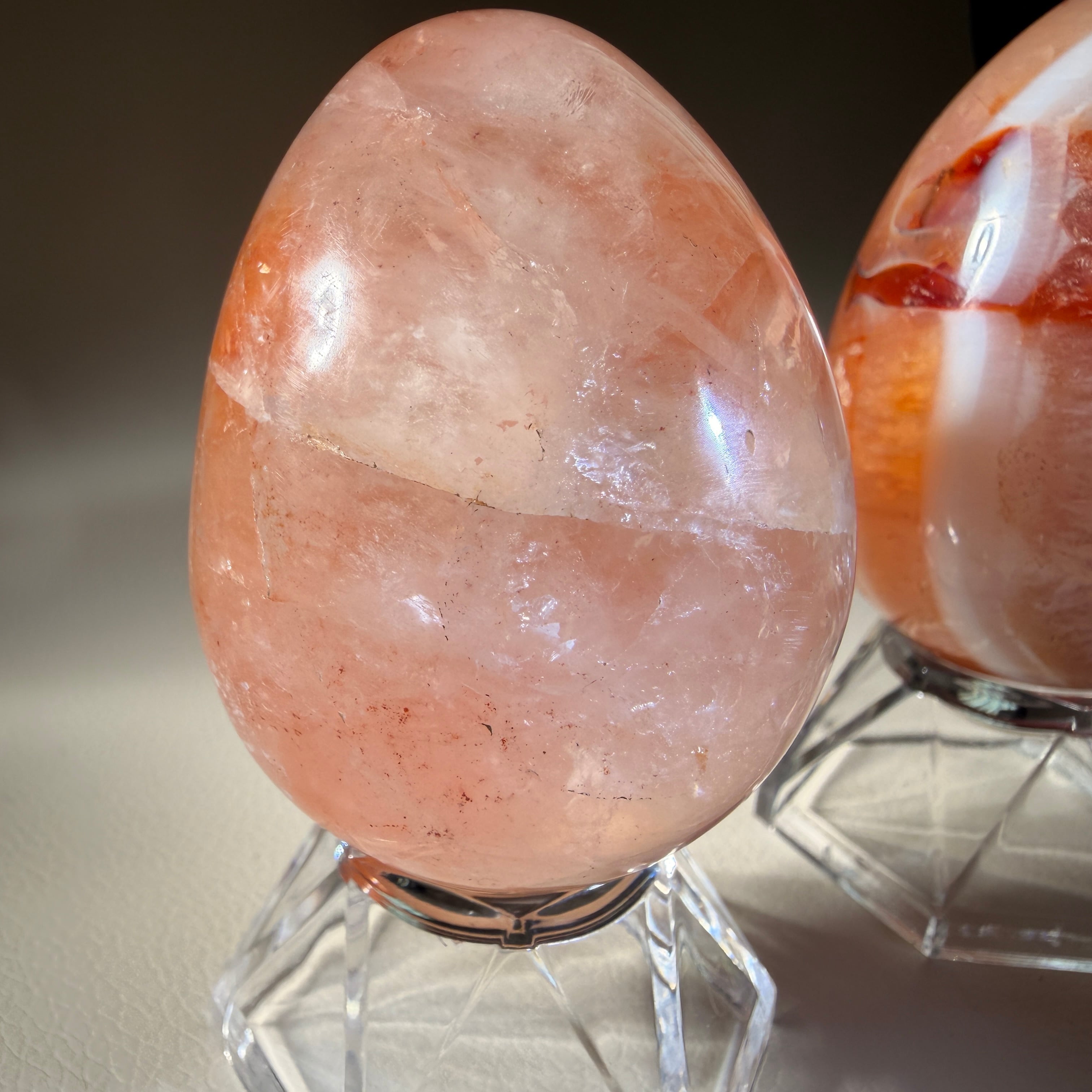 やわらかなピーチカラーに、層状の模様がゆるやかに重なるメノウのたまご形です。
