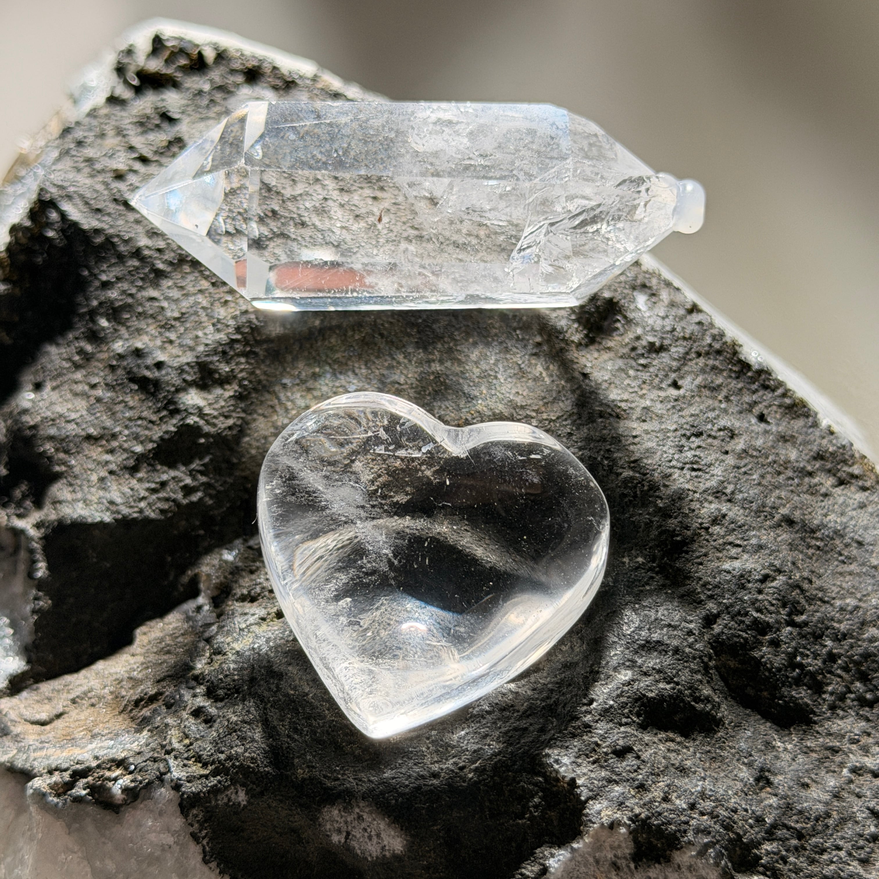 透明度のバランスが美しい水晶ハートと、両剣形のダブルポイント水晶を組み合わせたセットです。