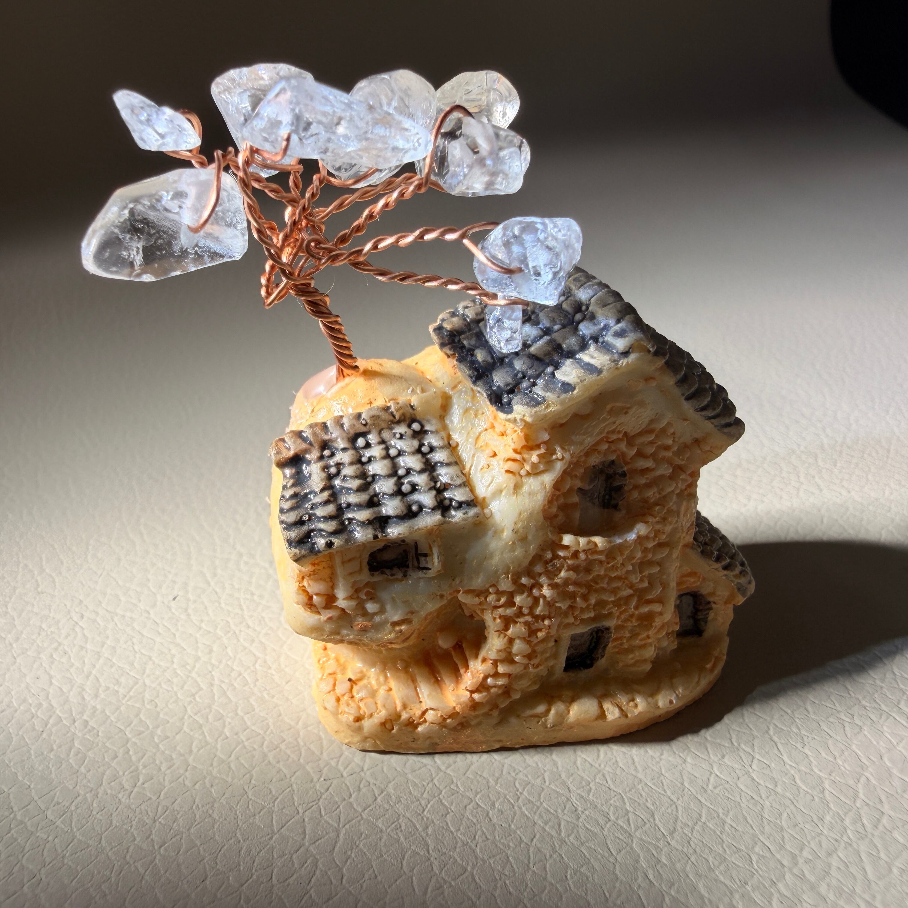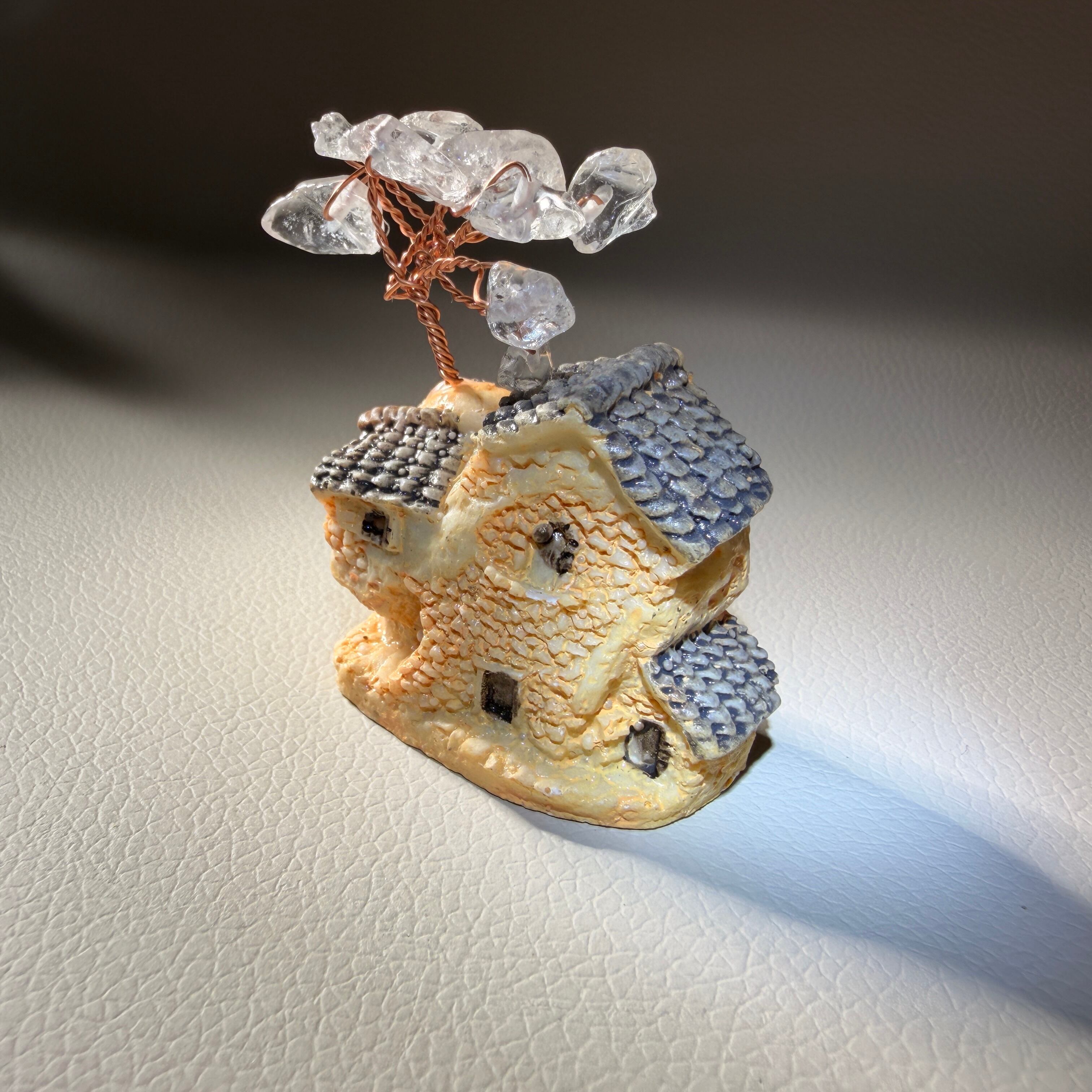 透明感のある水晶を枝先に添え、ツリーの形に仕立てた置物です。