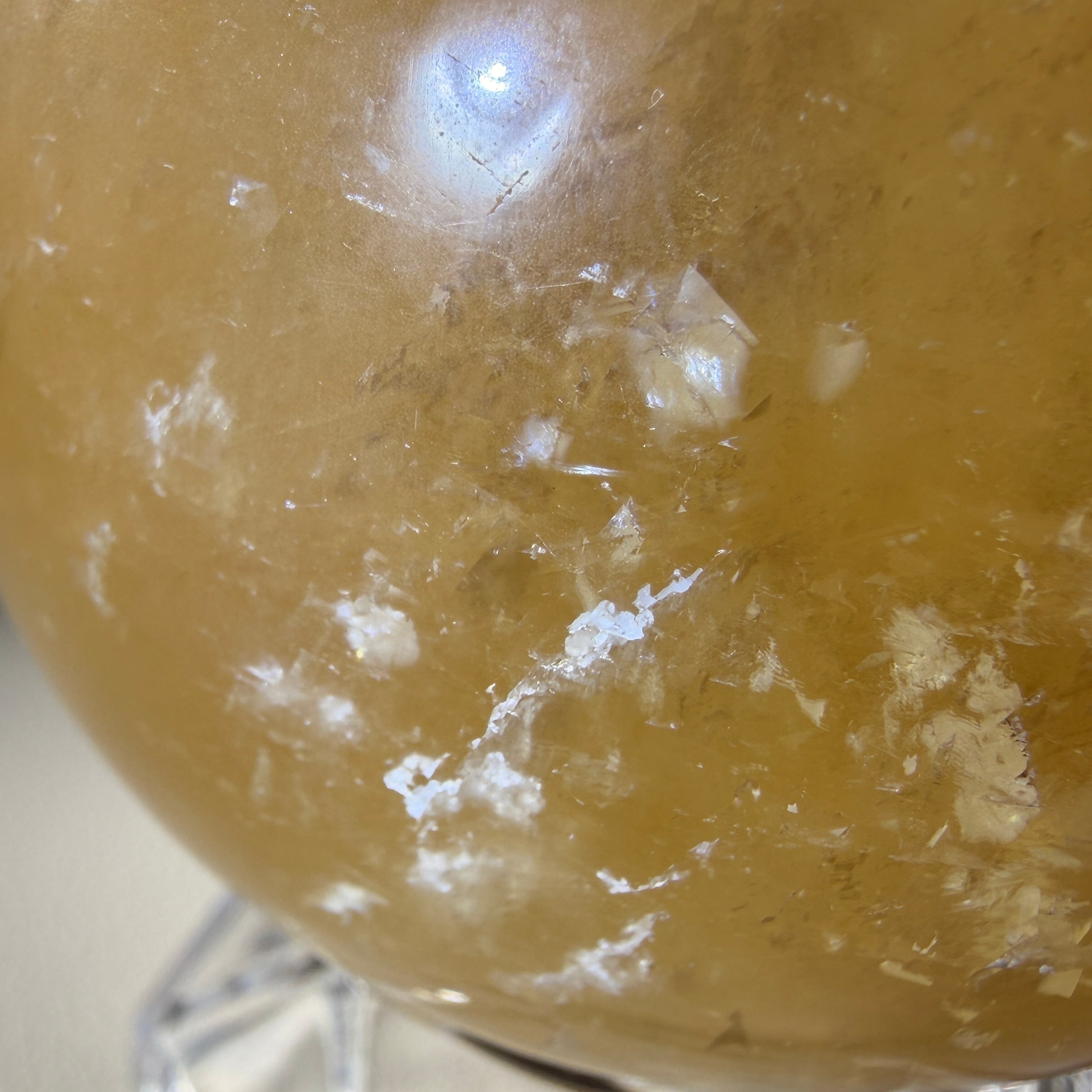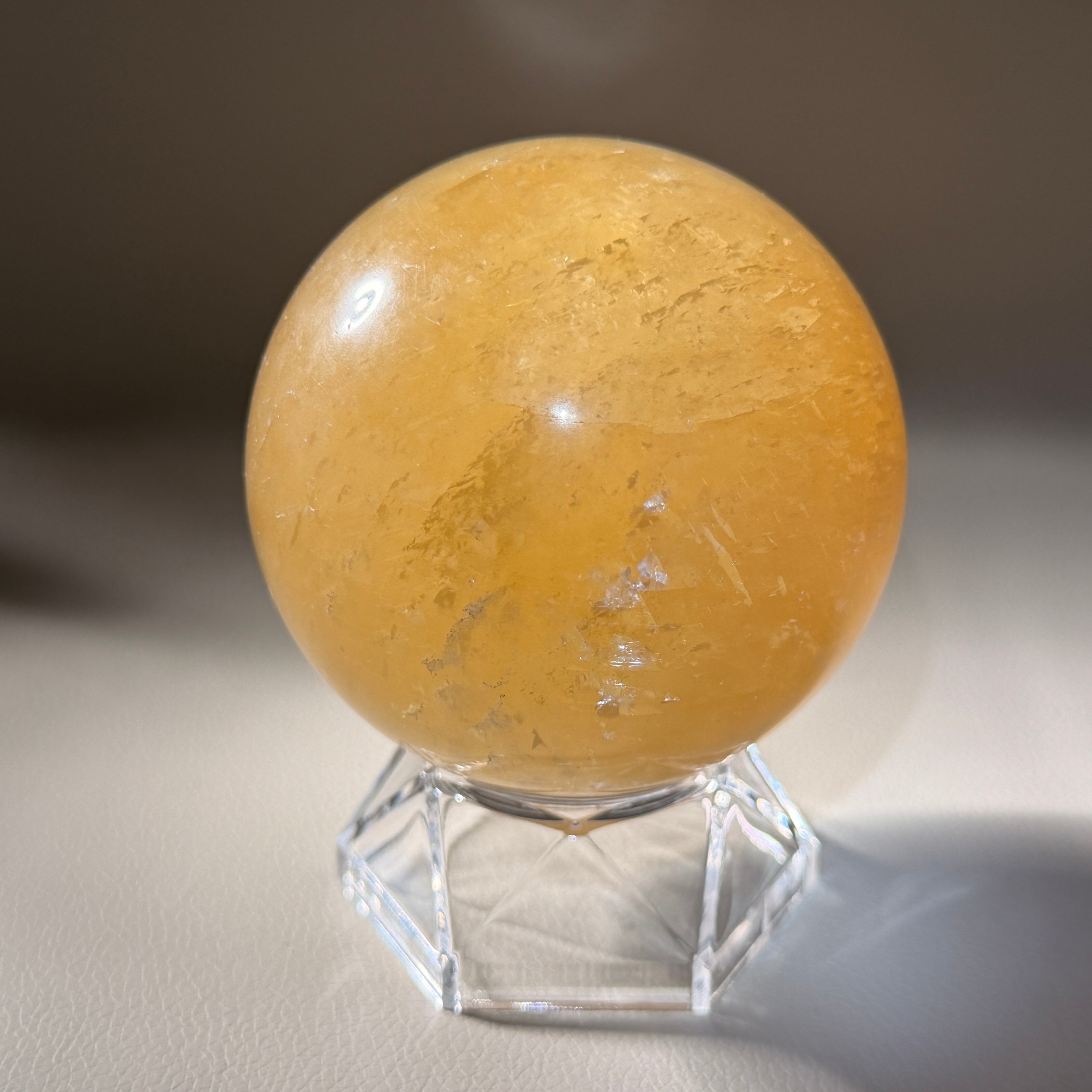 陽だまりのようなイエローの発色に、結晶由来の層が静かに重なるイエローカルサイトの大玉スフィアです。