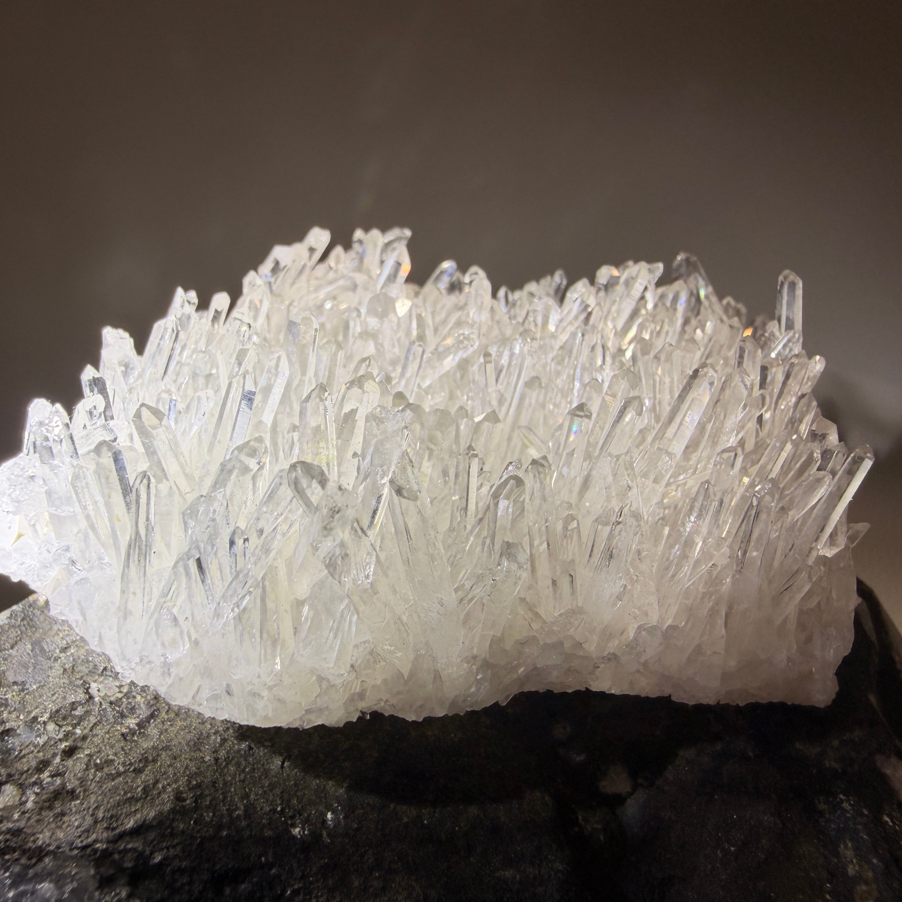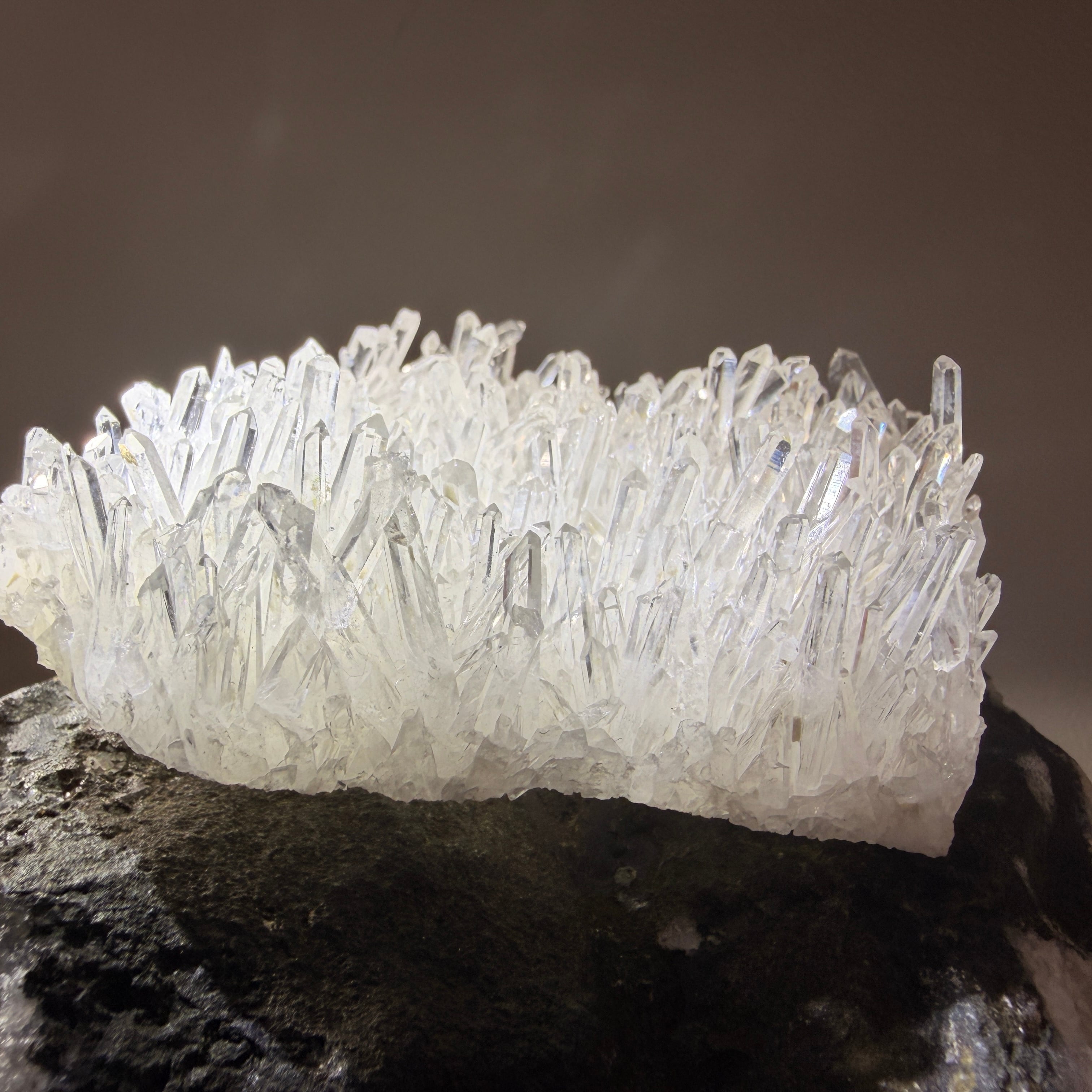 透明感のあるポイントが密に立ち上がり、光を受けて繊細な反射を見せるレムリアンクオーツクラスターです。