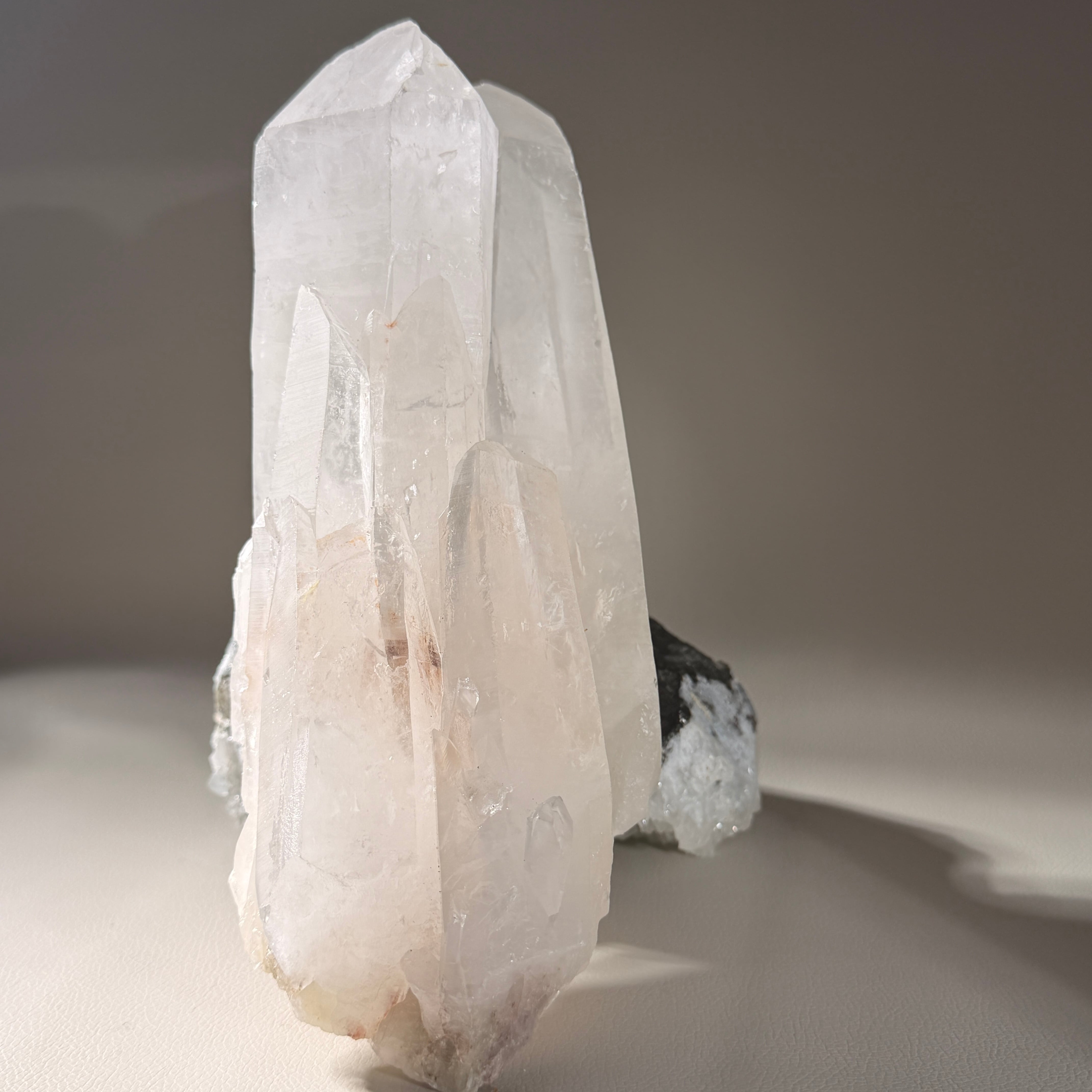 透明感のあるポイントが重なり合い、結晶の立ち上がりが堂々としたマダガスカル水晶クラスターです。