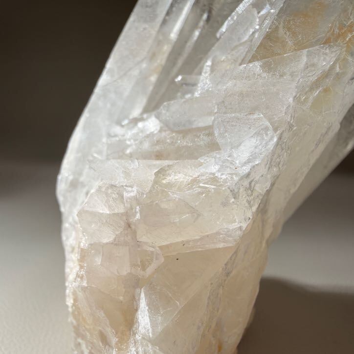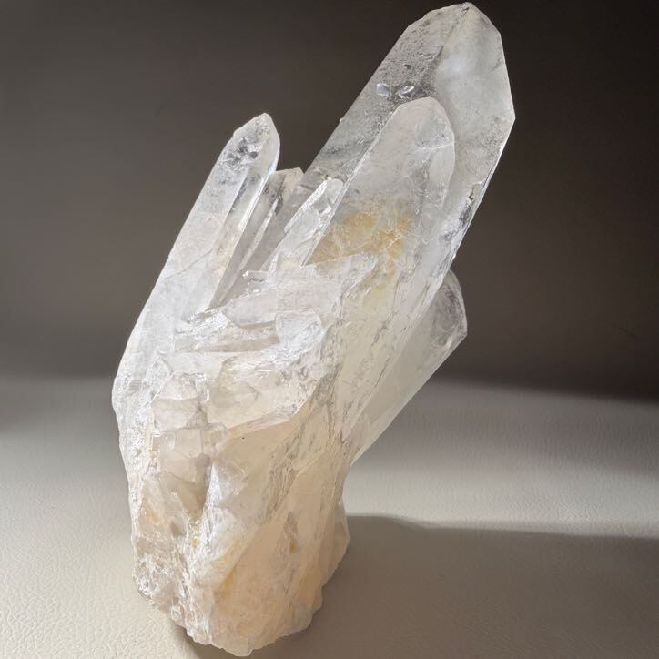 こちらは複数の結晶が重なり合って伸びるクラスター形状で、空間全体に清らかな印象をもたらします。
