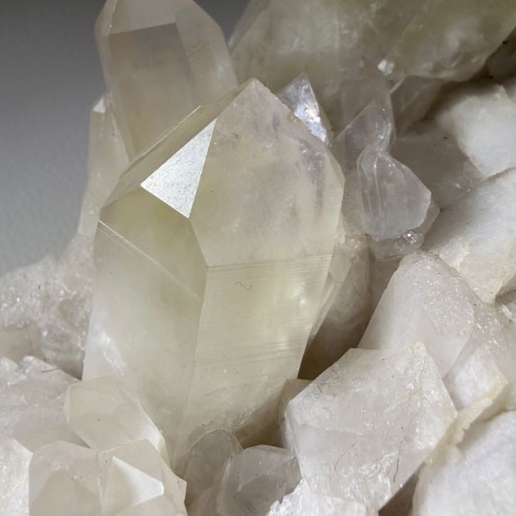 こちらは大小の結晶が重なり合うクラスターに、やわらかな黄金色のポイントが際立つ存在感のある一点です。