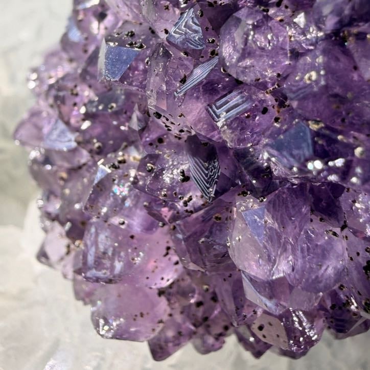こちらは小ぶりなクラスターの中に、紫の濃淡と内包由来の表情が重なり合う一点で、神秘的な存在感があります。