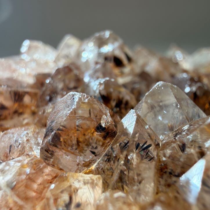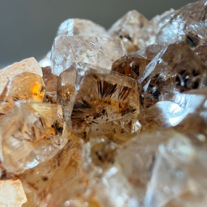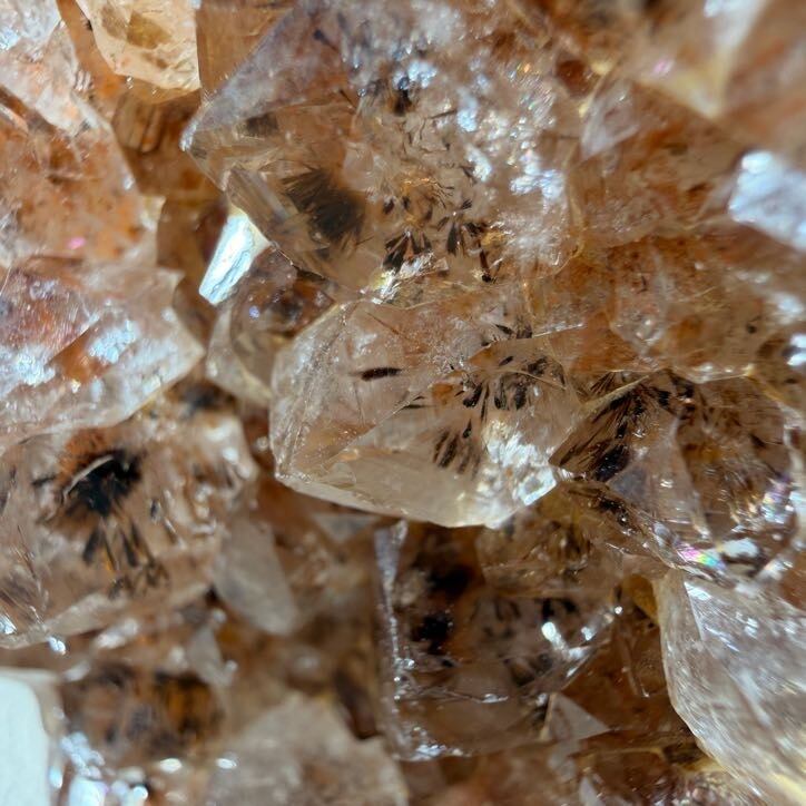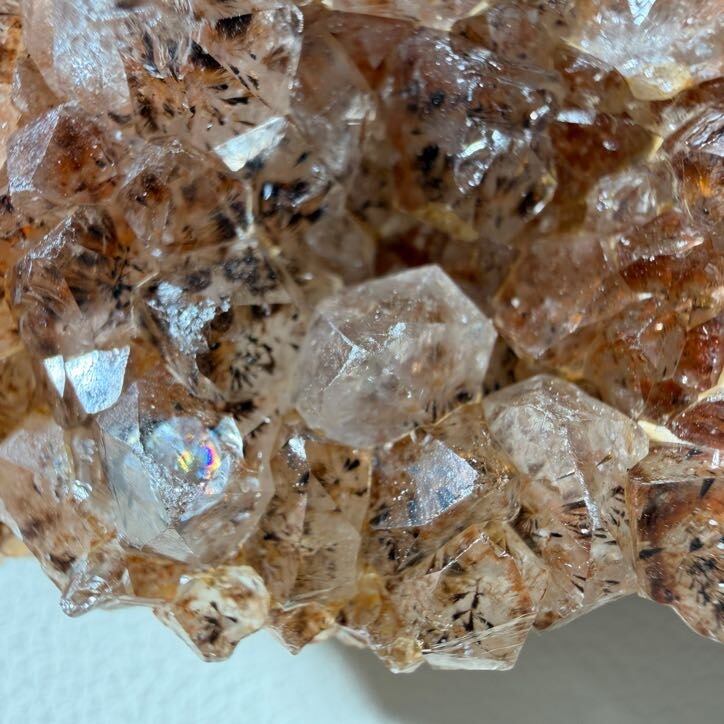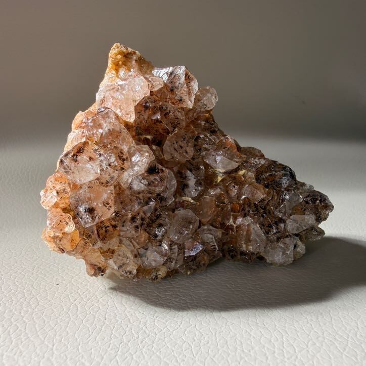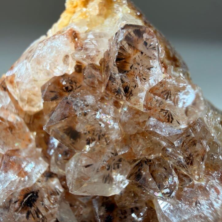 こちらは透明感のある結晶の中に、黒褐色の内包由来の表情が広がり、角度によっては虹も感じられる印象的なクラスターです。