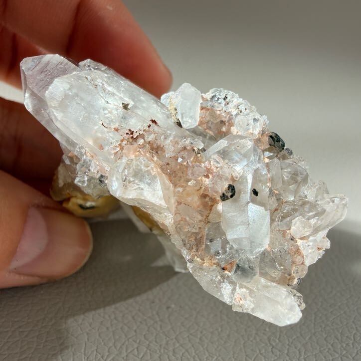 こちらは透明感のある結晶に、黒色ややわらかな黄みを帯びた共生由来の表情が重なり、ひとつとして同じもののない個性を感じられるミニクラスターです。