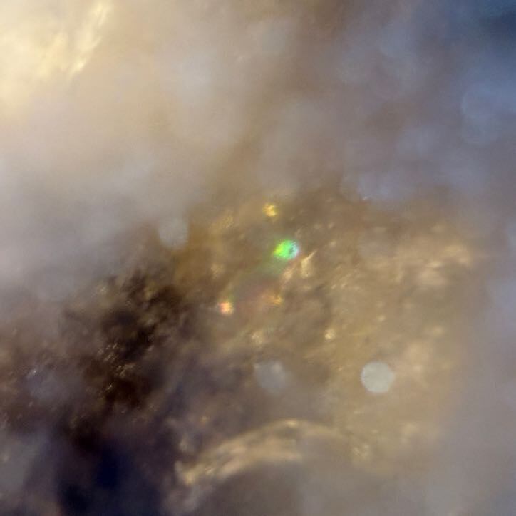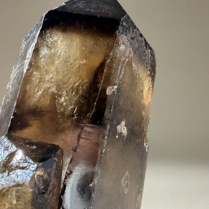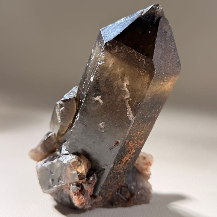 こちらは力強く立ち上がる結晶に、黒の濃淡と内側の透明感が重なり、角度によっては虹も感じられる印象的な一点です。