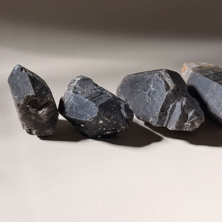 こちらはそれぞれに異なる結晶の形や表情が見られ、静かな重厚感と落ち着いた力強さを感じられるモリオン原石です。