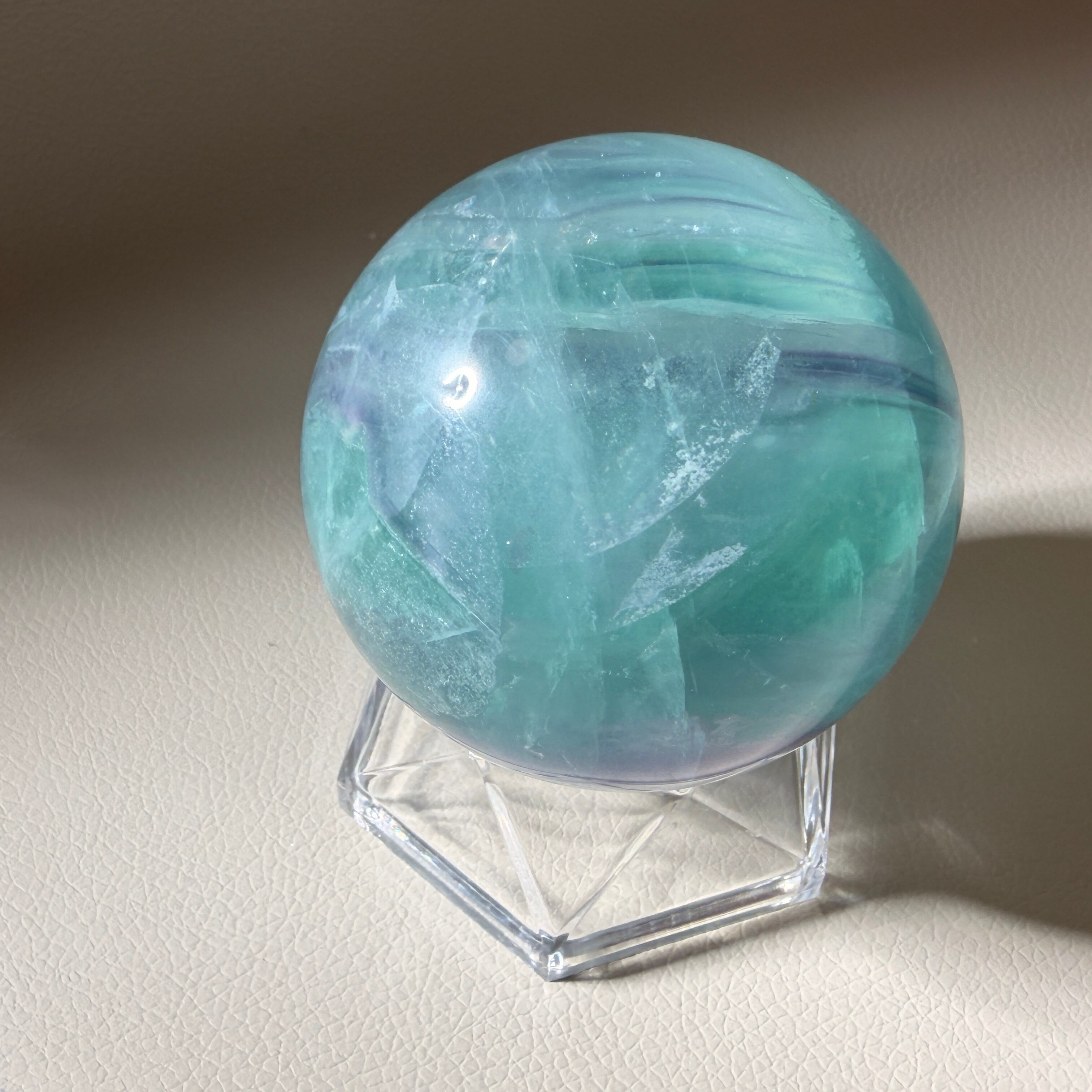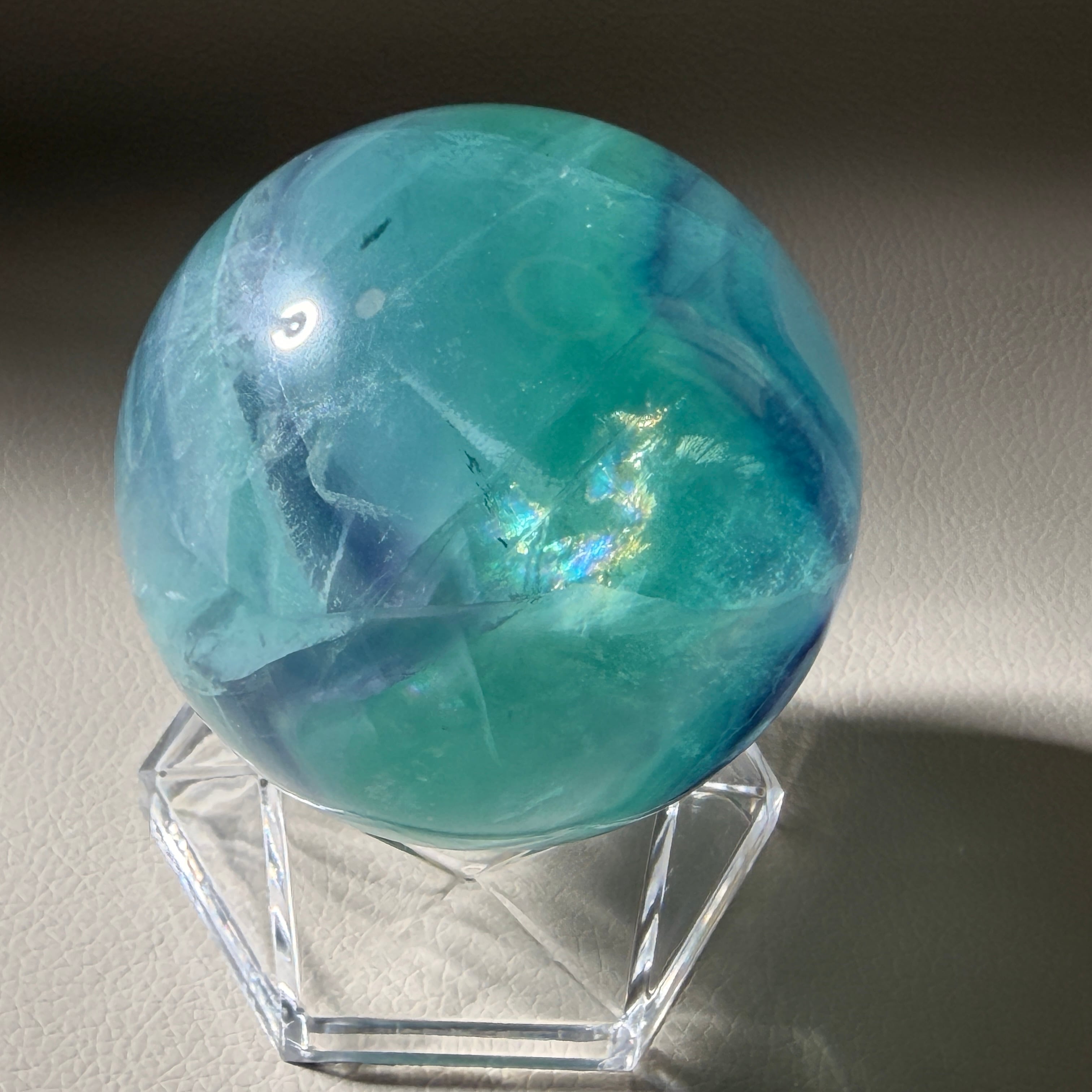 こちらのスフィアは、青緑を中心にした透明感のバランスが美しく、内包由来の表情や光に浮かぶ虹が静かな存在感を見せてくれます。