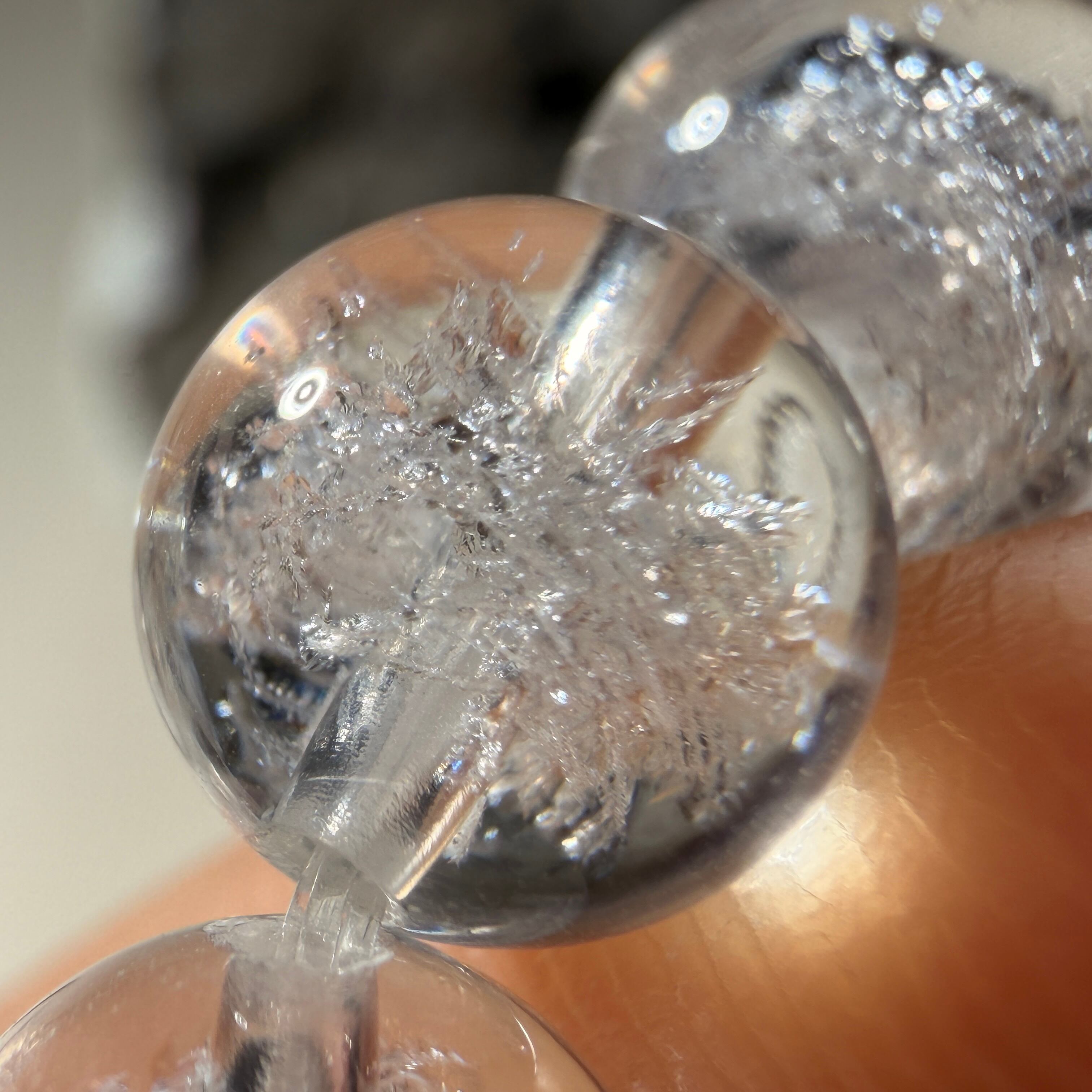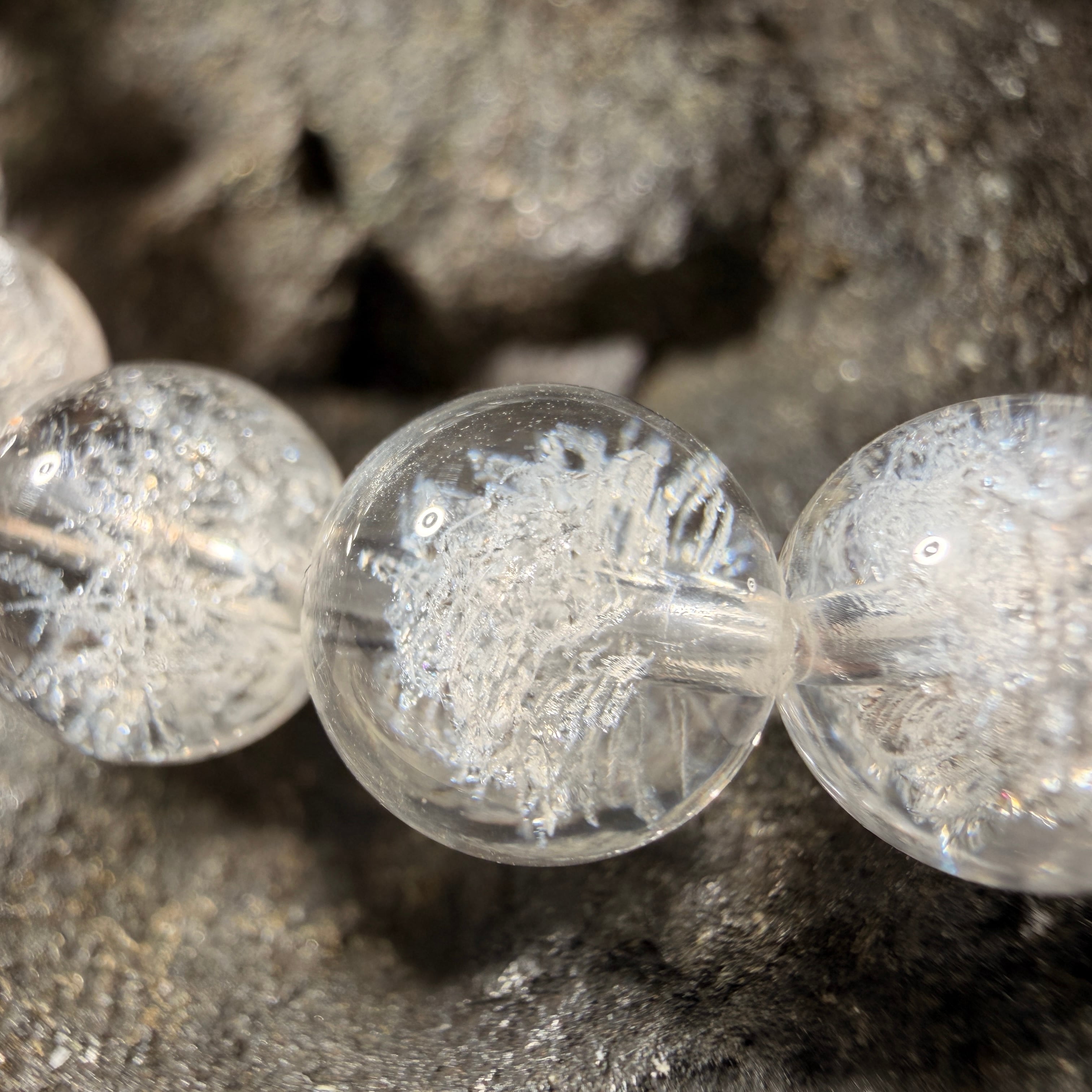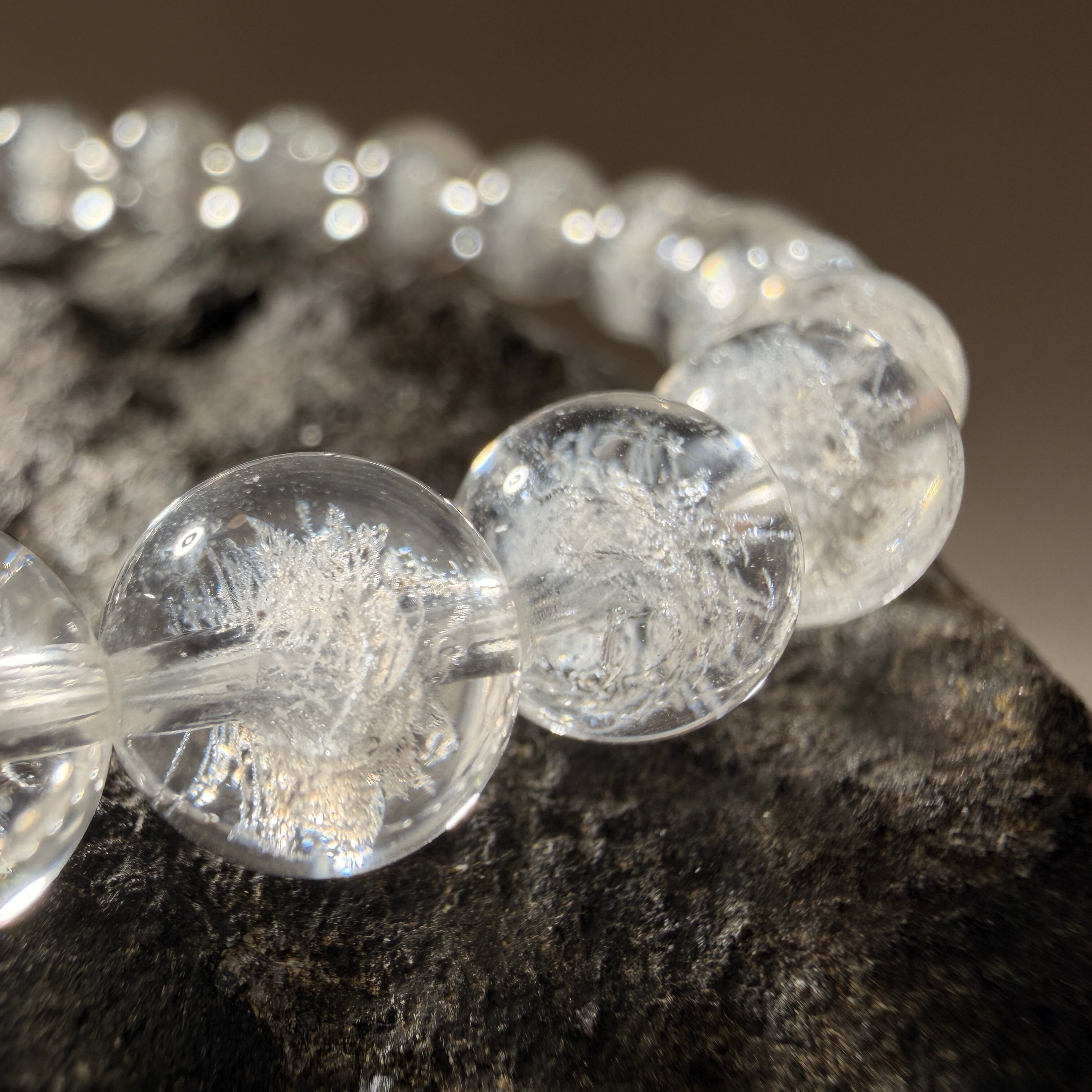 透明感のある水晶の内部に、雪の結晶を思わせる幻想的な模様が見えるブレスレットです。