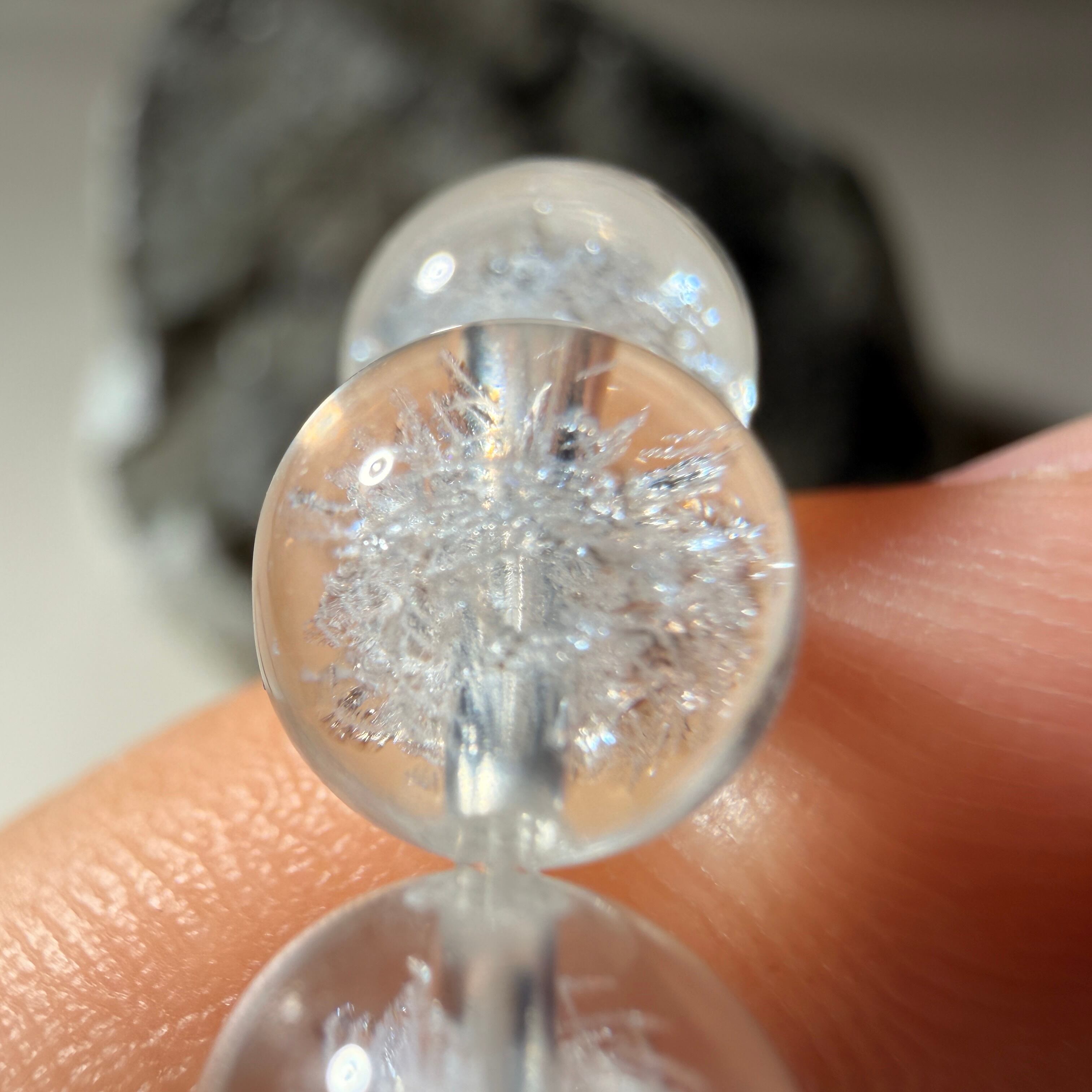 こちらは水晶の内部にレーザー彫刻が施されており、ひと粒ごとに静かな冬景色のような印象を楽しめます。