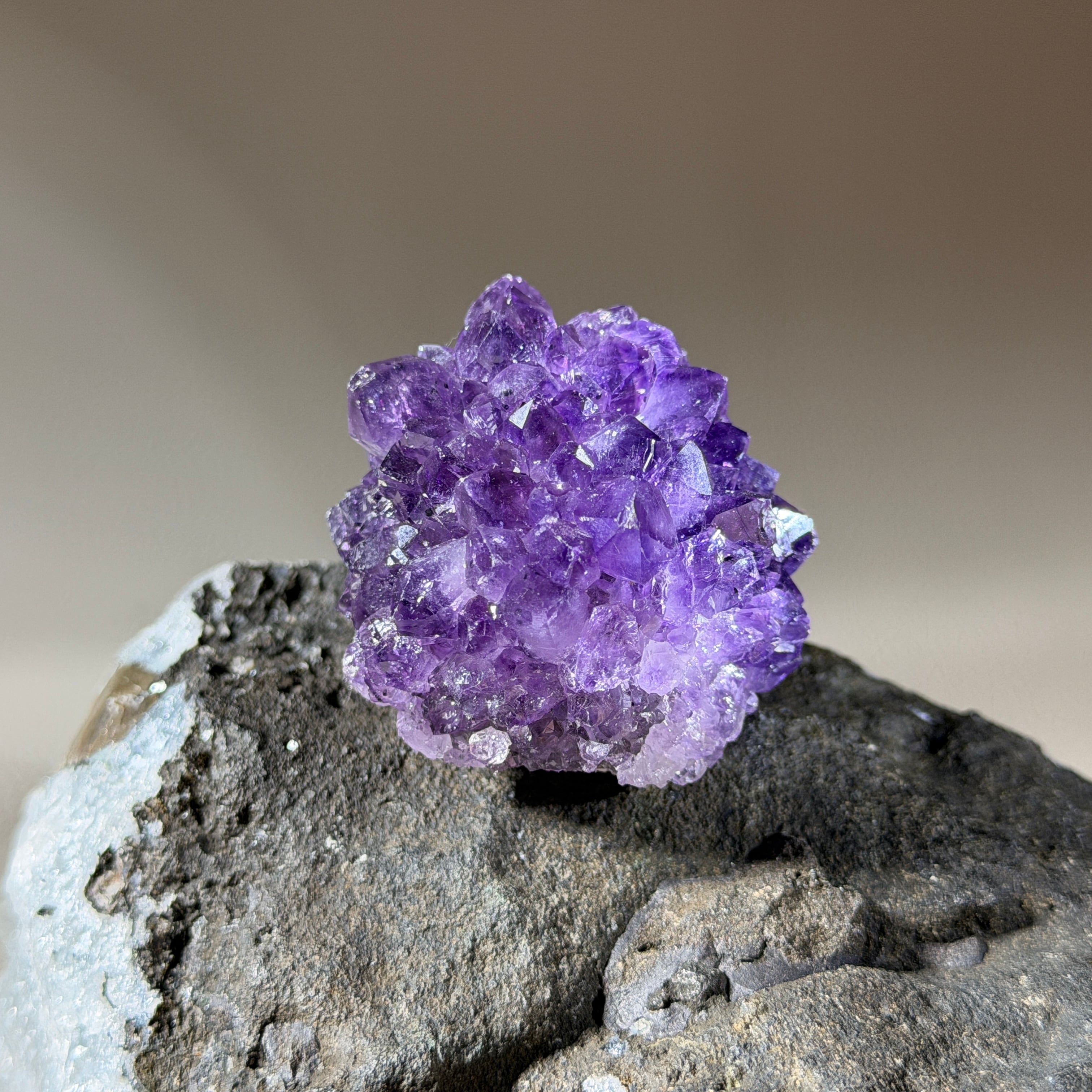 ころんとした存在感の中に、紫の結晶がぎゅっと詰まったアメジストのウニジオードです。