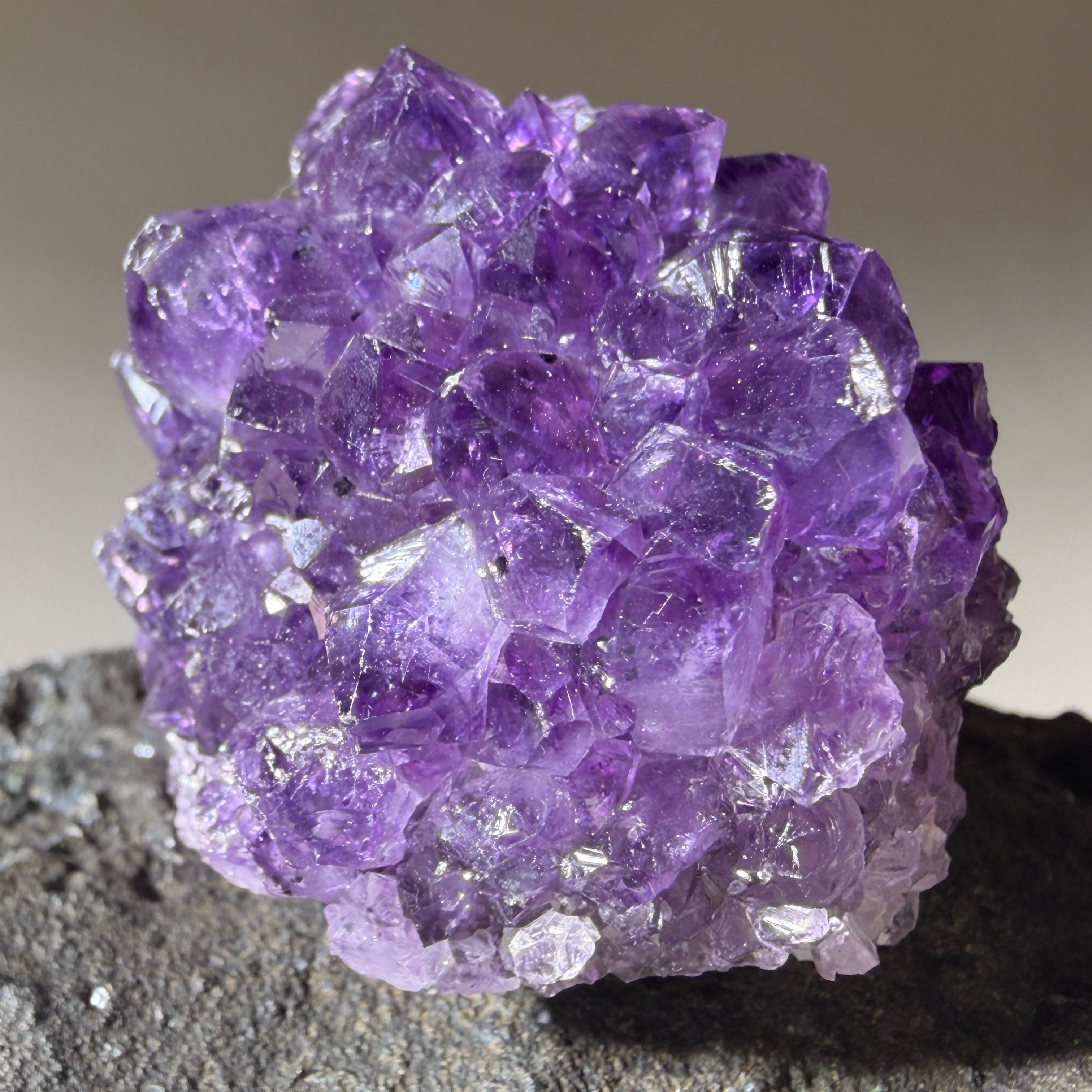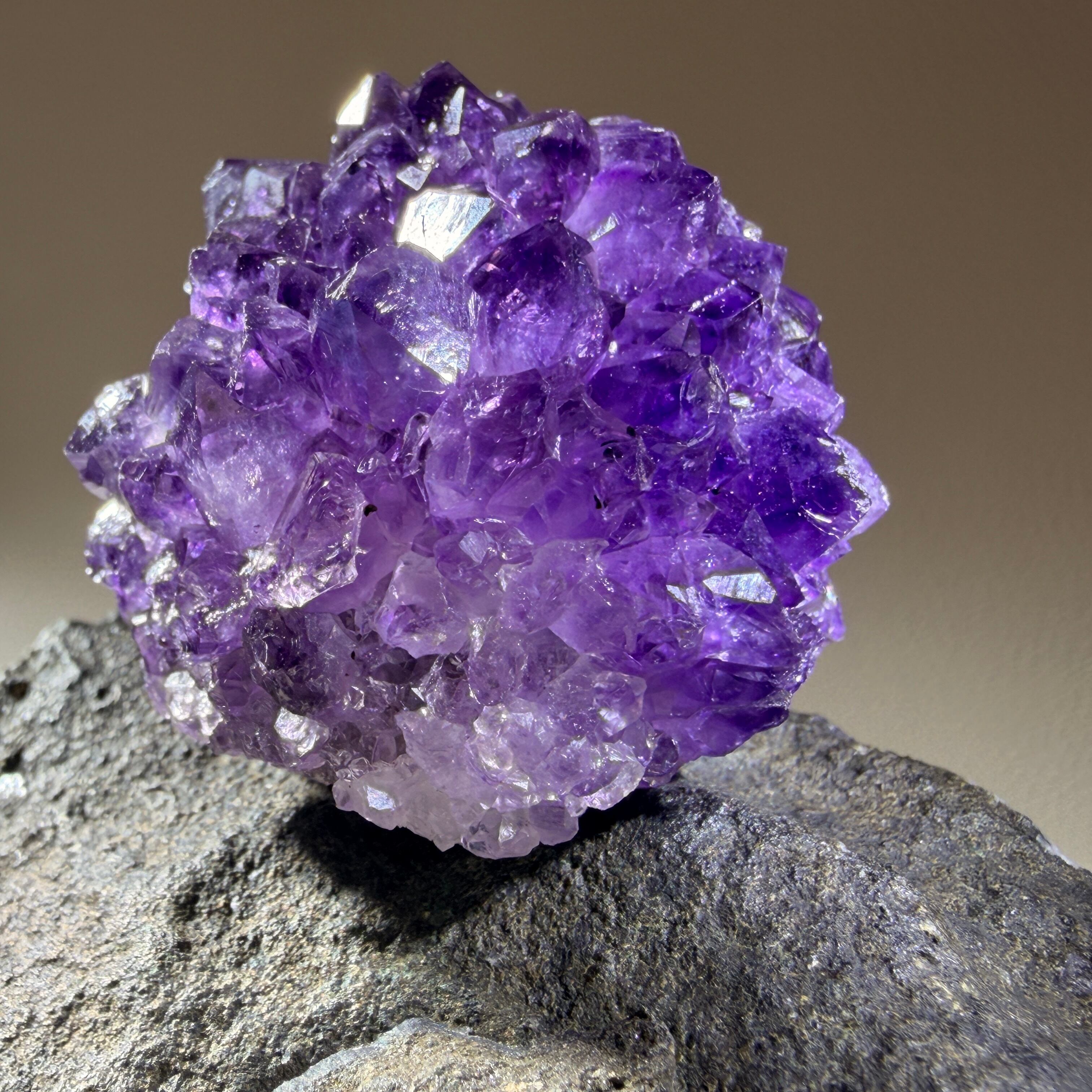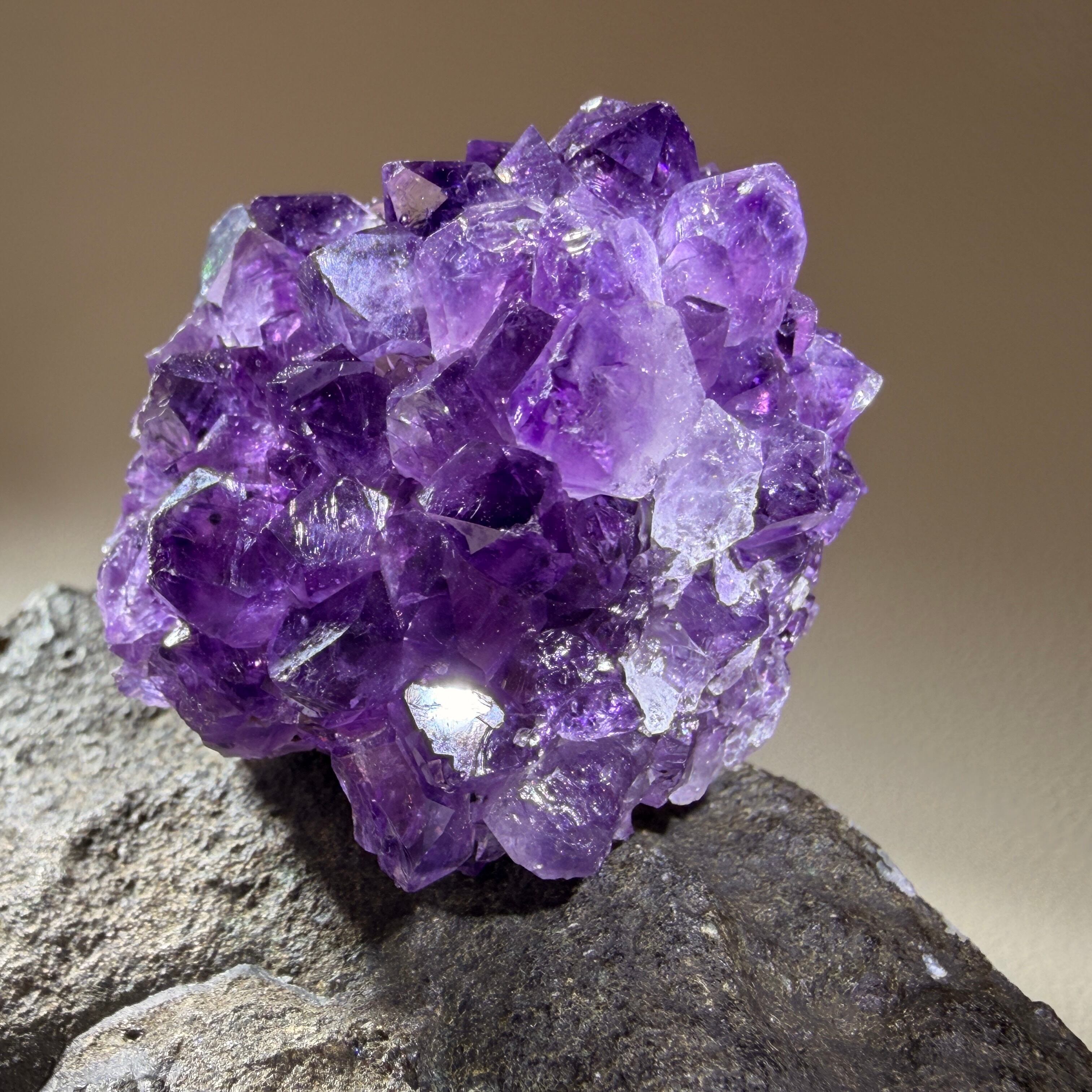 濃淡のある紫色と結晶面のきらめきが重なり、見る角度によって神秘的な奥行きと表情の変化を楽しめます。