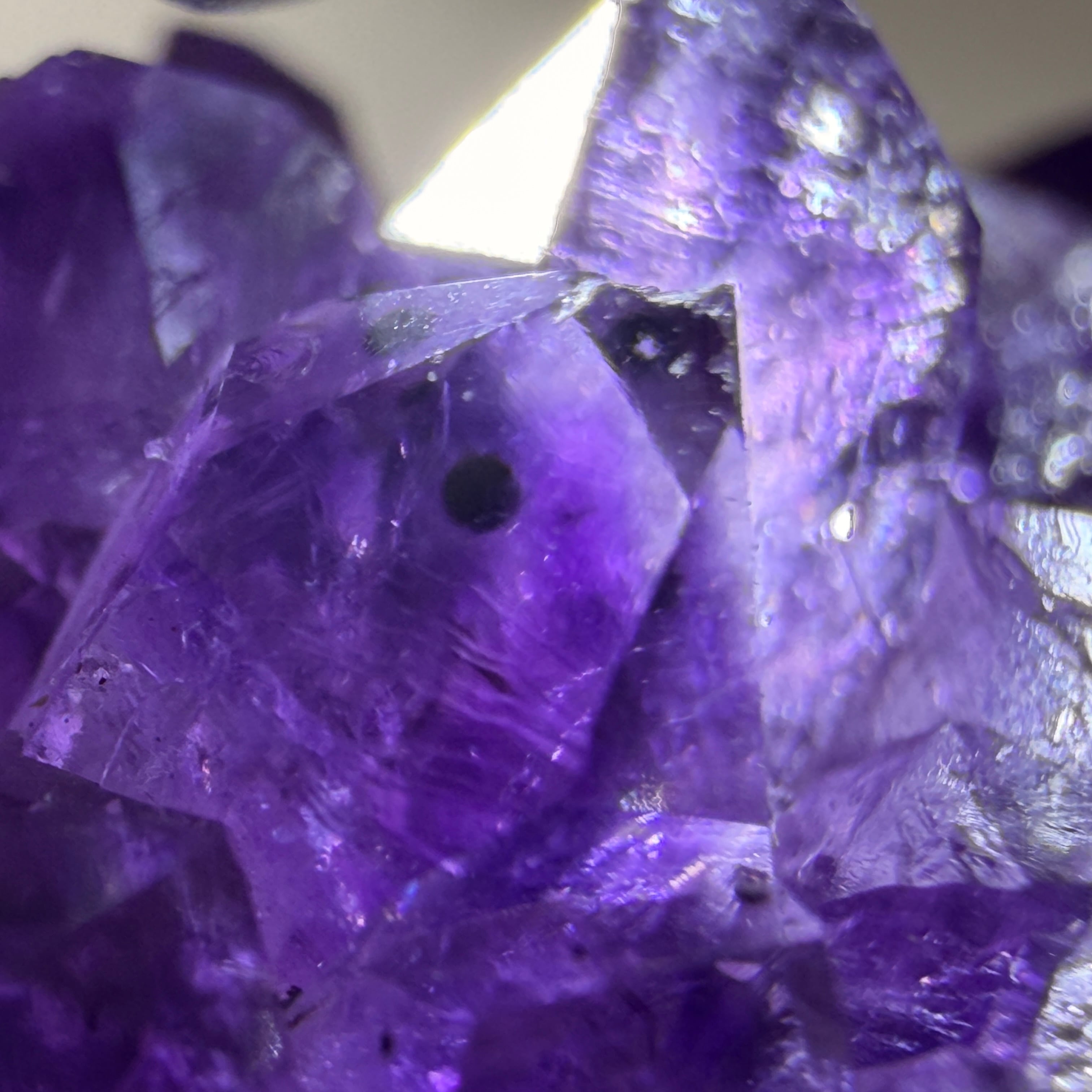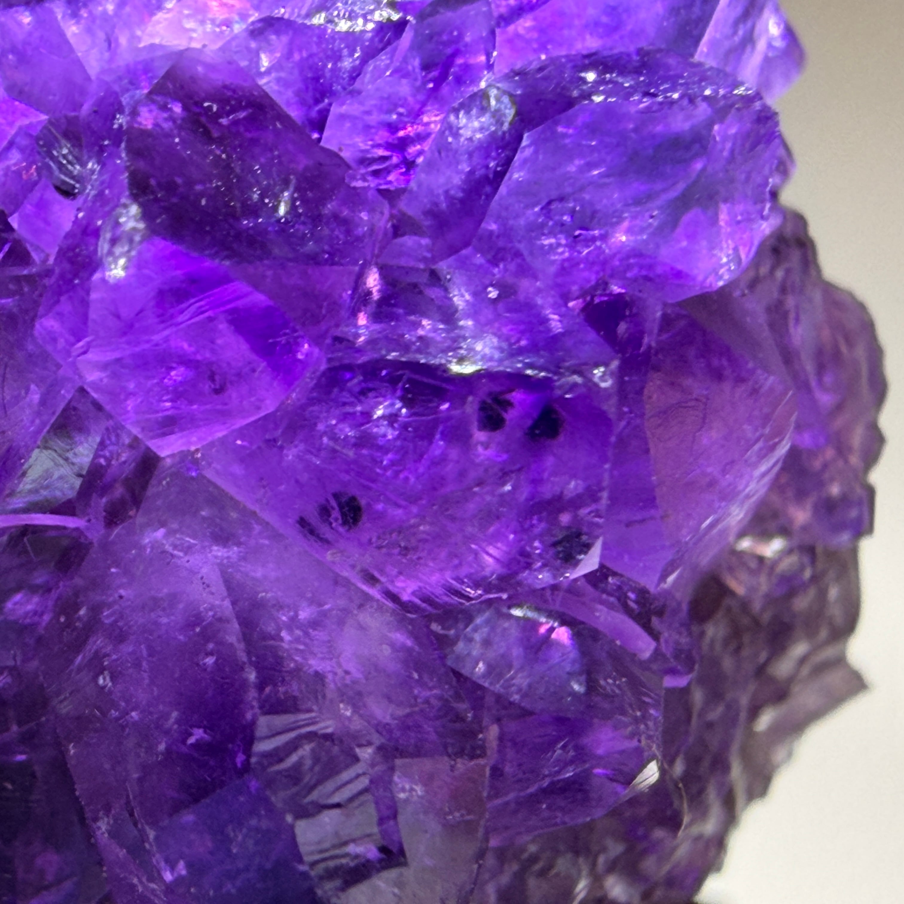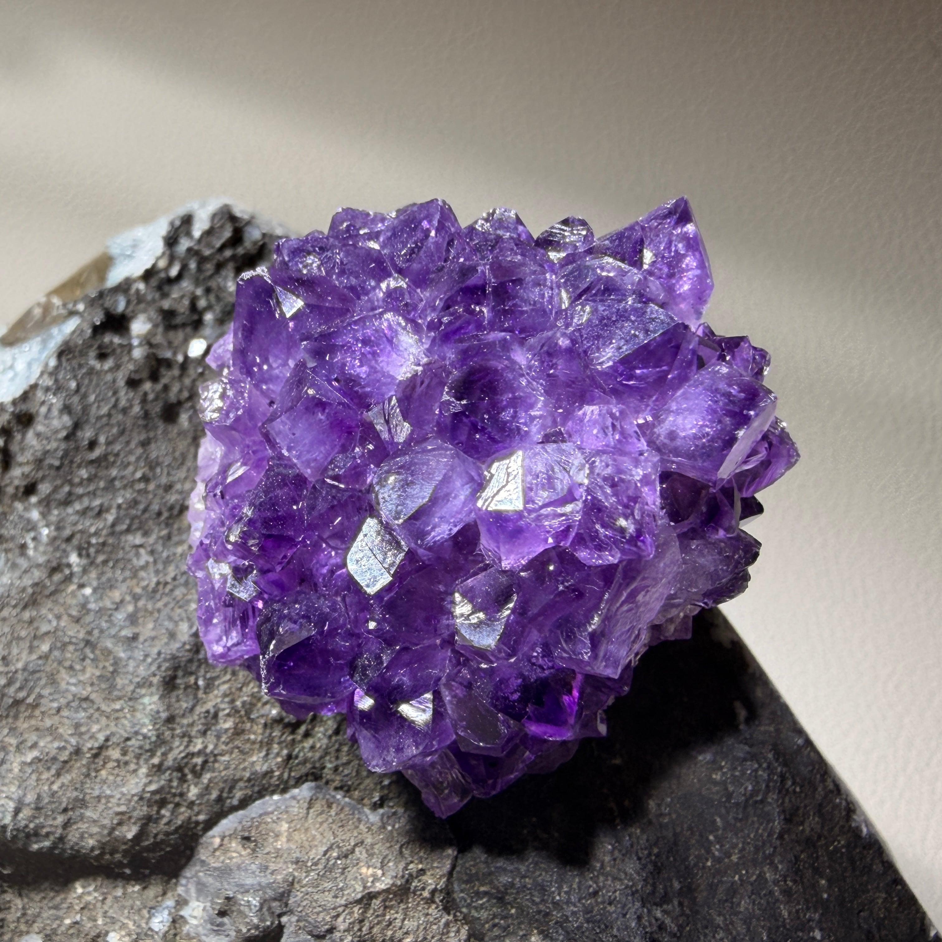 濃淡のある紫色と結晶面のきらめきが重なり、見る角度によって神秘的な奥行きと表情の変化を楽しめます。